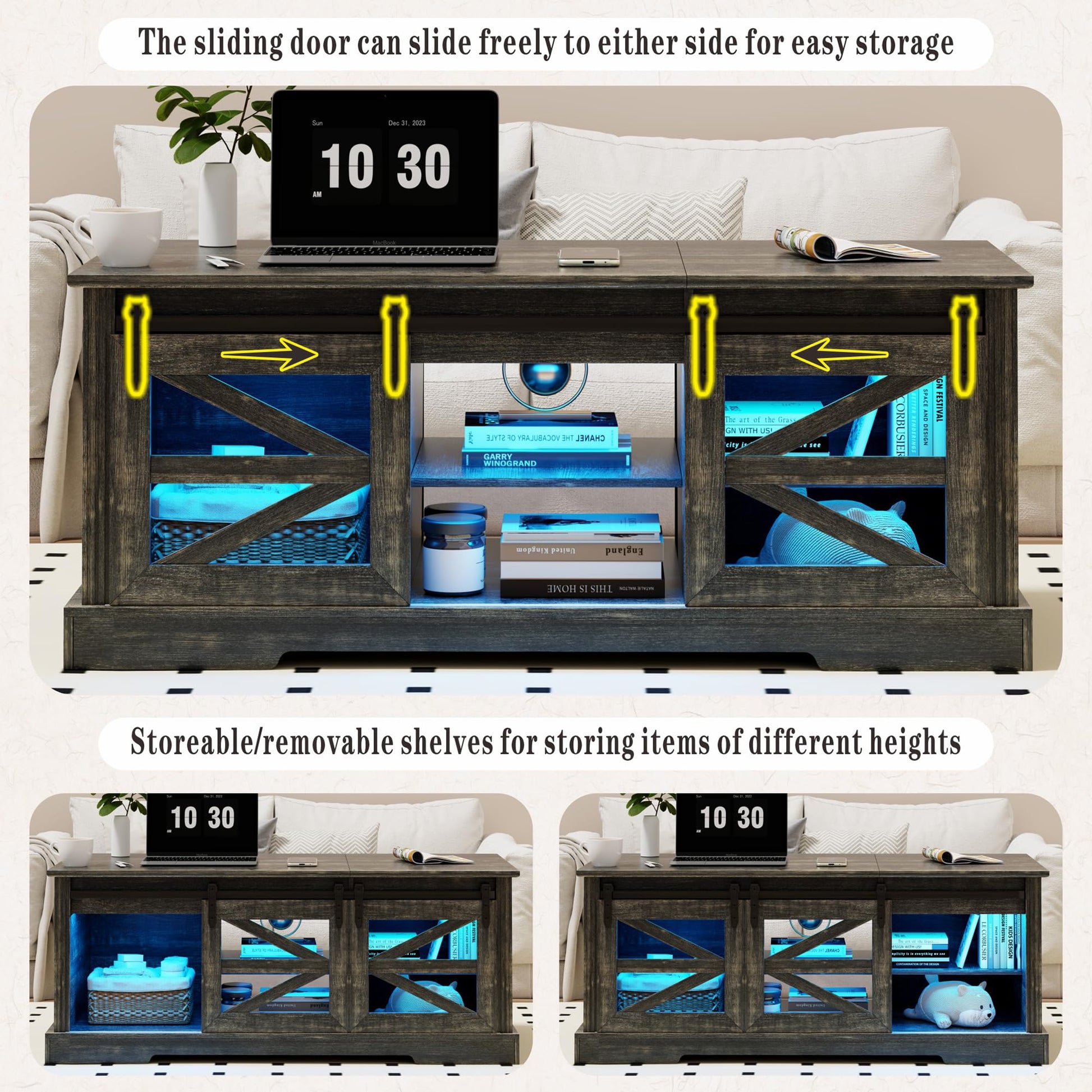 - [Large storage space]: 21.7D*47.3W*19.7H inches, this farmhouse coffee table has two cabinets and a central open storage compartment, and is equipped with sliding barn doors. The layers of storage compartments on both sides can be detachable to place items of different heights, effectively storing and enhancing the beauty of the space