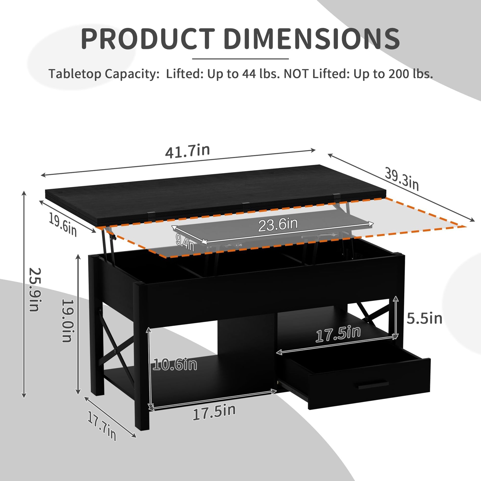 Lift Top Coffee Table with Storage, Black Lift Top Coffee Table with Drawers&Hidden Compartment, Multi-Functional Center Table, Convertible Coffee Tables into Dining Table for Home Living Room Office