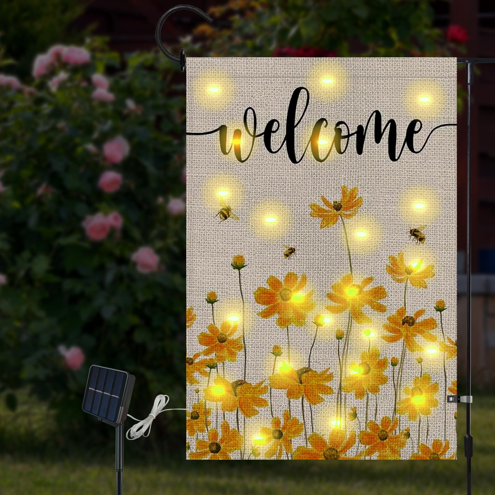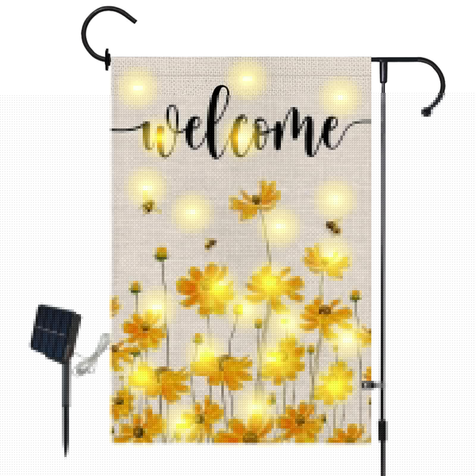 Lighted Spring Summer Floral Welcome Garden Flag, 12 x 18 Inch Double Sided Vertical Burlap Sunflower Bee Led Garden Flag for Seasonal Holiday Outdoor Yard Decoration