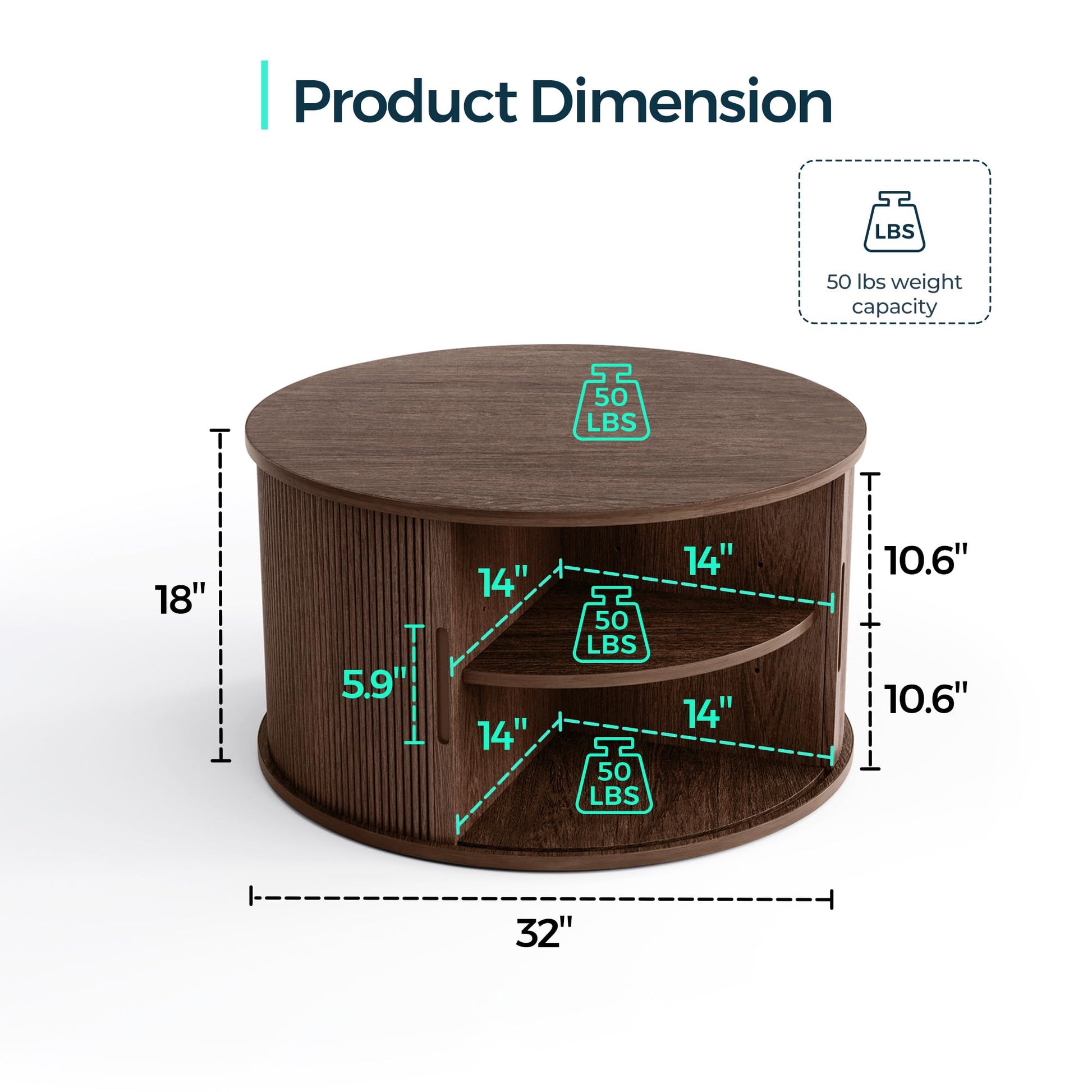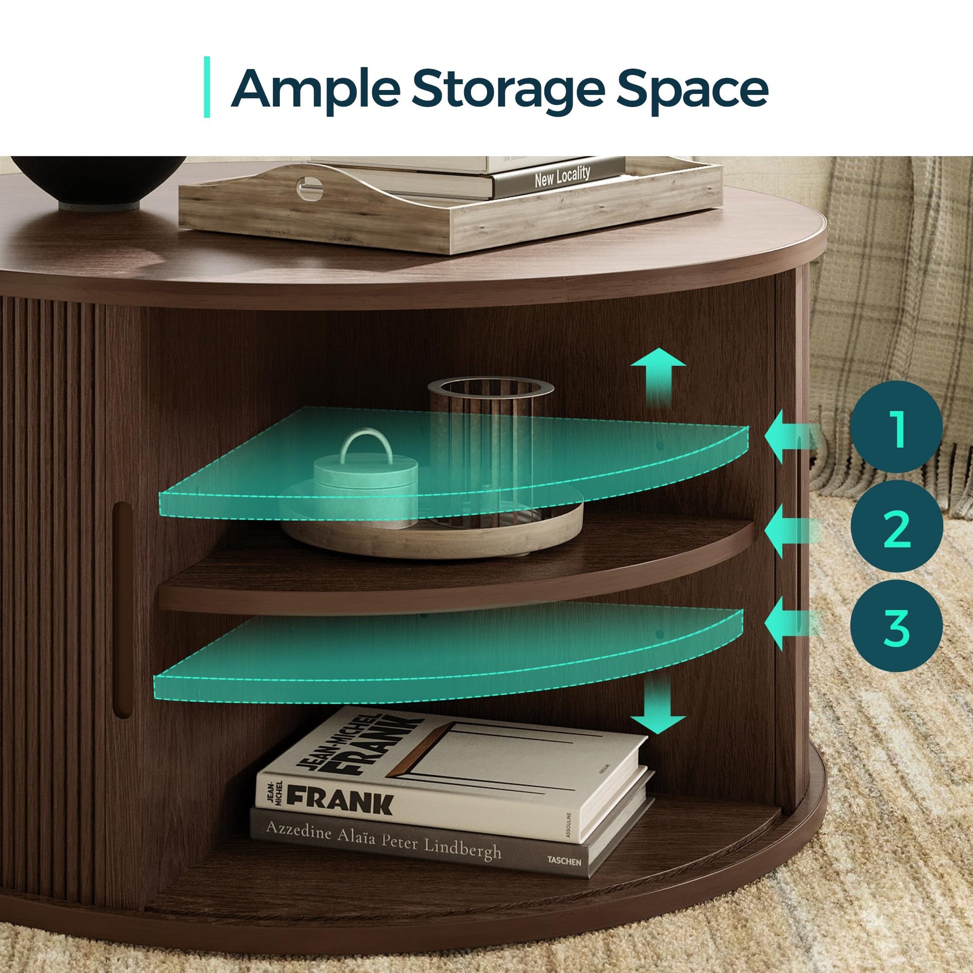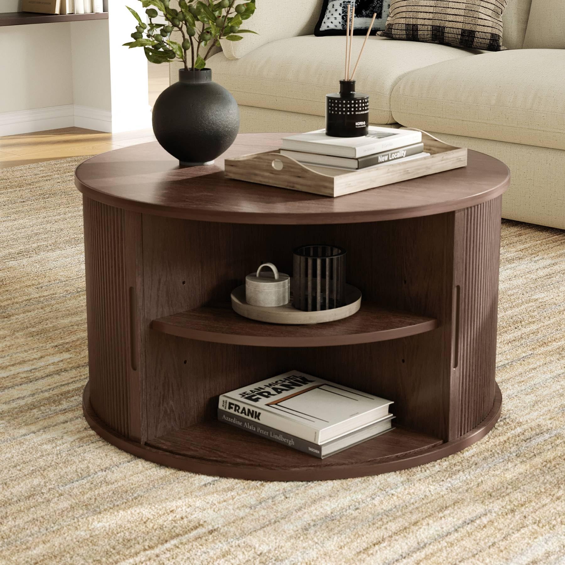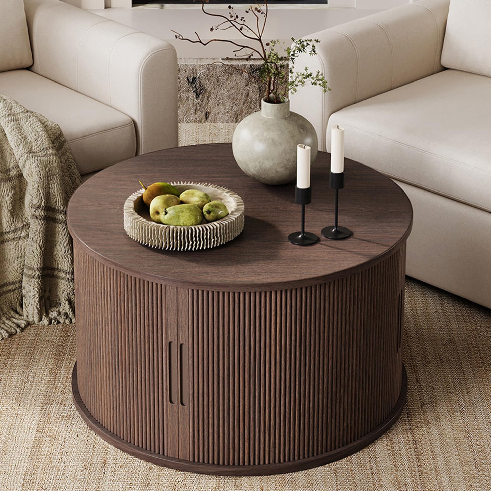 LINSY HOME Round Coffee Table, 31.5" Drum Coffee Table with Sliding Tambour Door, Fluted Accent Center Table with Storage, Mid Century Modern Coffee Table for Living Room, Walnut