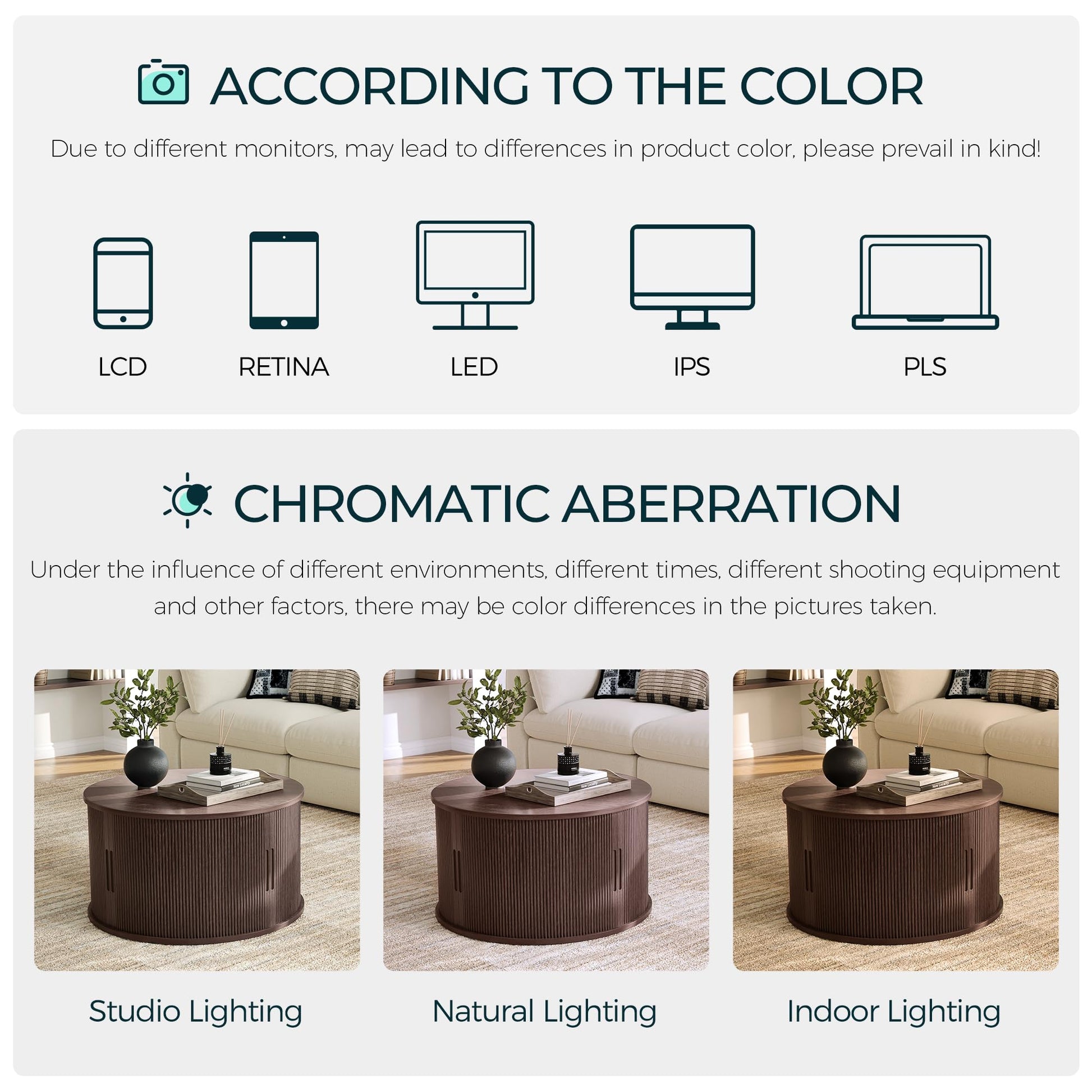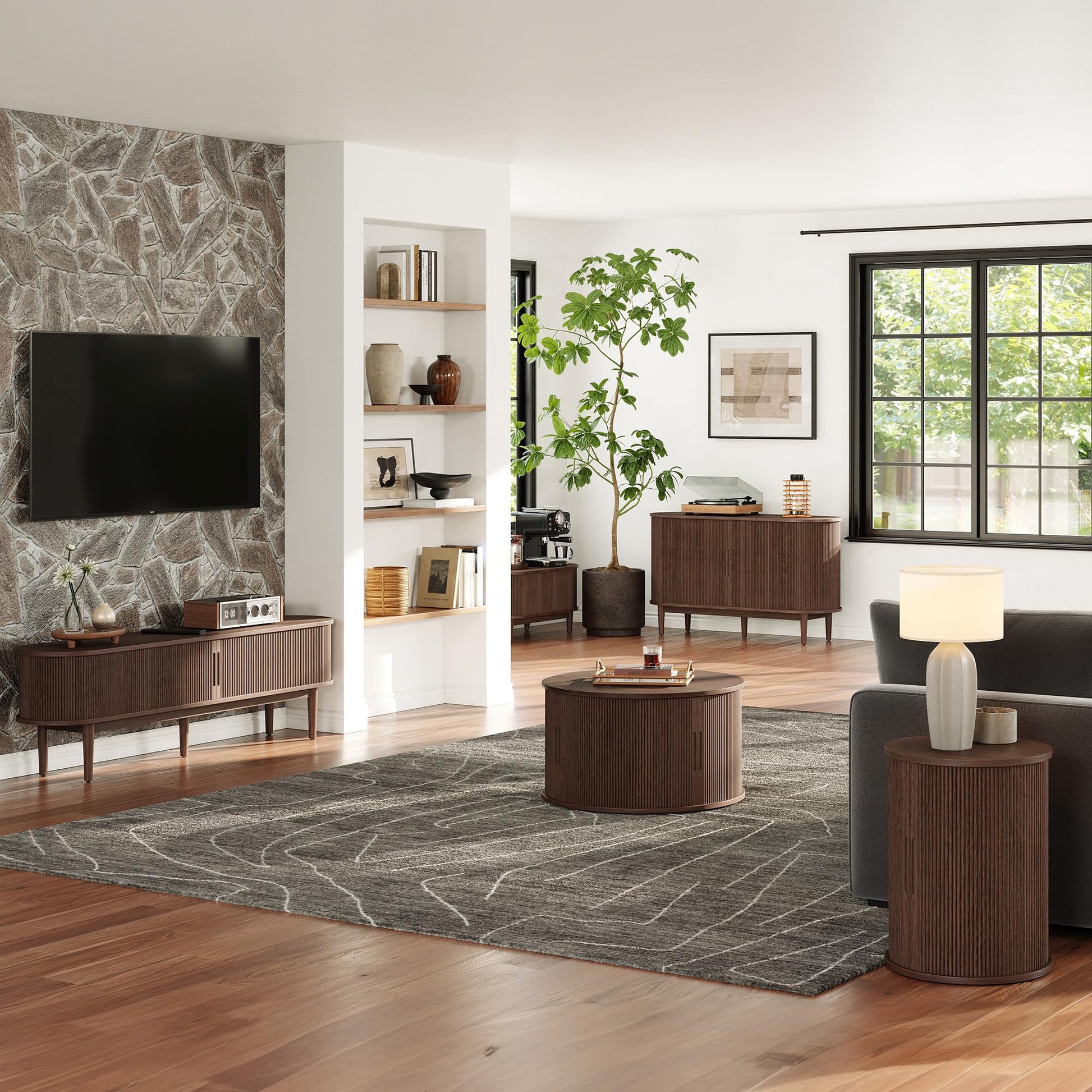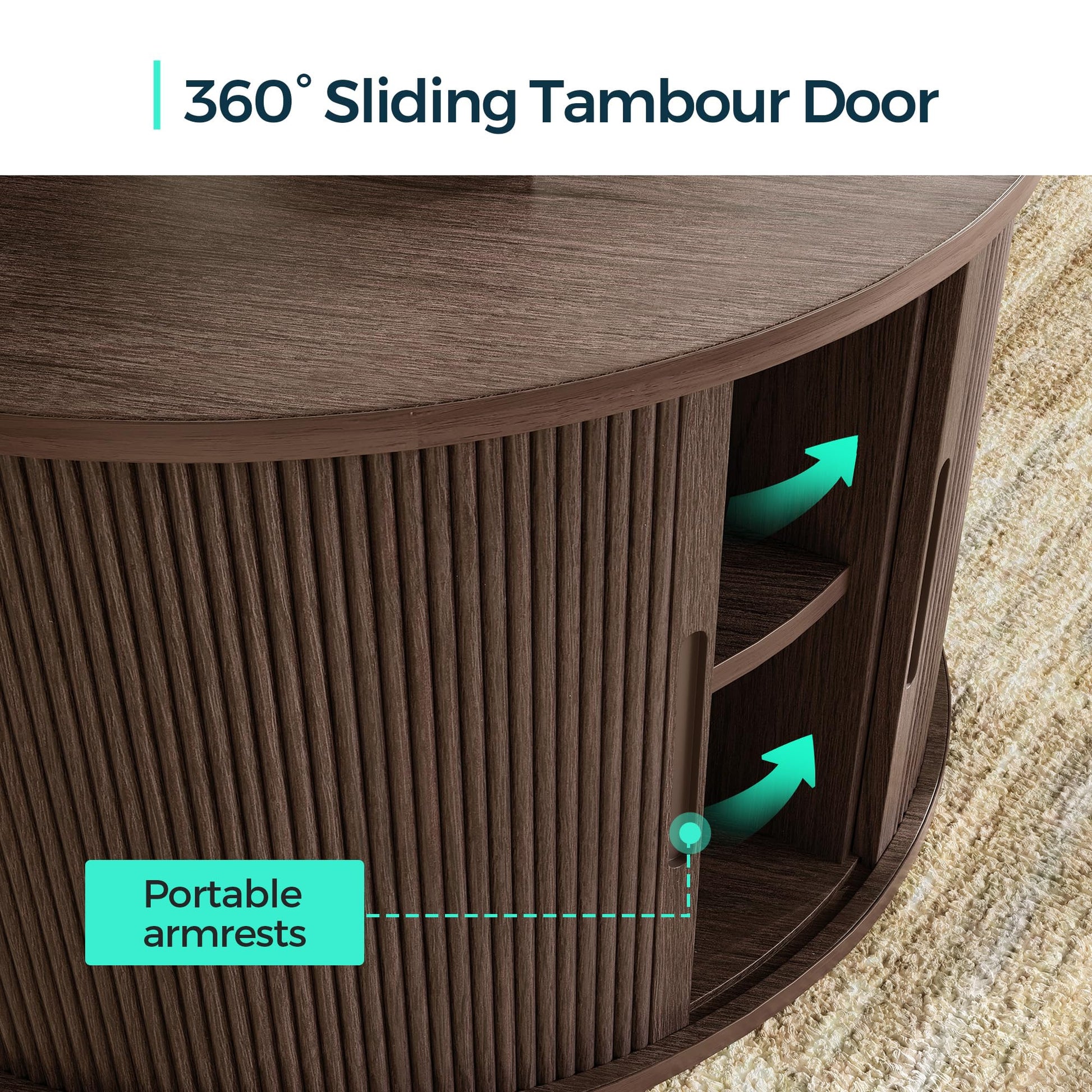 - Fluted Tambour Sliding Door - The fluted tambour door is a distinctive curved shape and slides smoothly, making this round coffee table provides convenient access to all your necessities while bringing a touch of mid-century modern style sophistication to your home