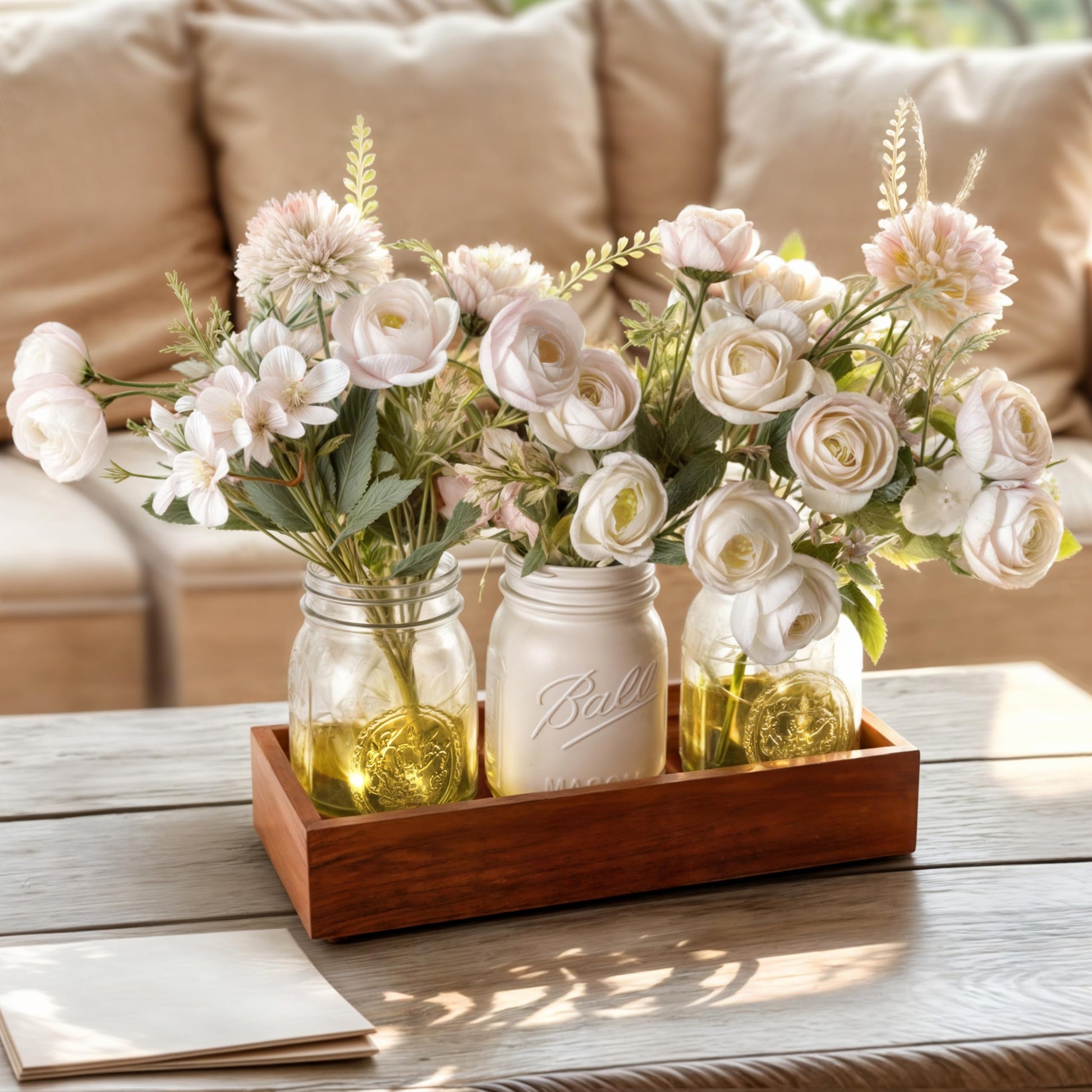 - 🪴【PREFERRED TABLE CENTERPIECE DECORATION】: 3 Jars and wooden tray plus string lights and flowers complement the color scheme, gorgeous colorful decorative effect suitable for most scenarios, modern or rustic home decor, weddings, Thanksgiving living room coffee table decorations