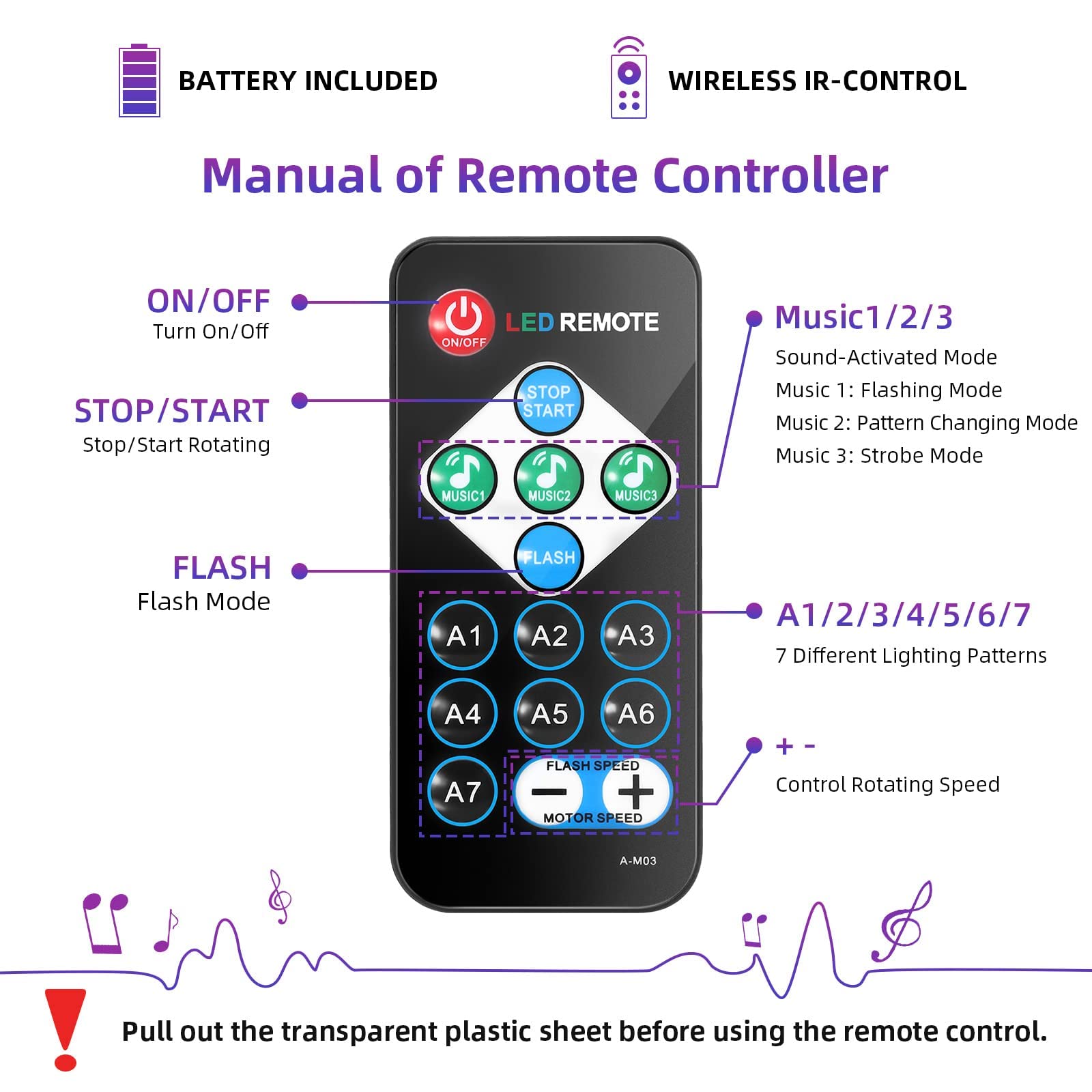 - 【Remote Controlled DJ LIGHT】Comes with a remote controller, you can use it to turn on/off the lights, change sound activated/lighting modes and control the rotating/flash speed. All functions on the remote, very easy to use.