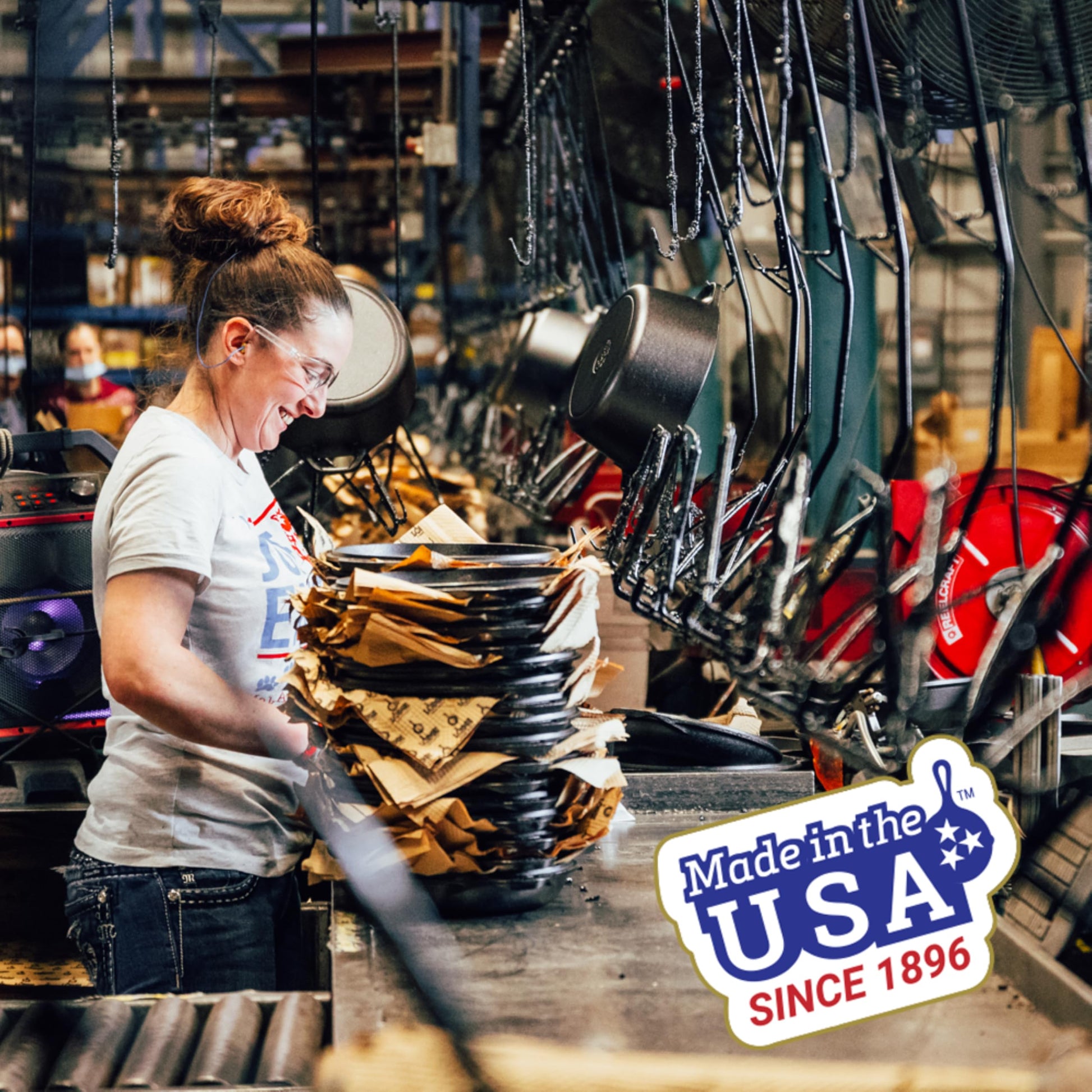 Details: Regarding the chip in the finish of the product: It is a result of seasoning the pan in production. The cookware is hanging as it rides on a conveyer through the seasoning process. As it rides through the seasoning tunnel, an electrostatic sprayer applies a natural vegetable oil seasoning to the pan. As it the pan passes through the seasoning ovens, the seasoning oil can sometimes collect into a small bubble at the lowest point of the pan and as it’s heated in the seasoning ovens, that bubble can develop a baked-like surface. That surface can sometimes flake and reveal a brownish color beneath. The brownish color is not rust but caramelized seasoning baked onto the iron itself and disappears with use. It is inherent in the seasoning process and not a defect.