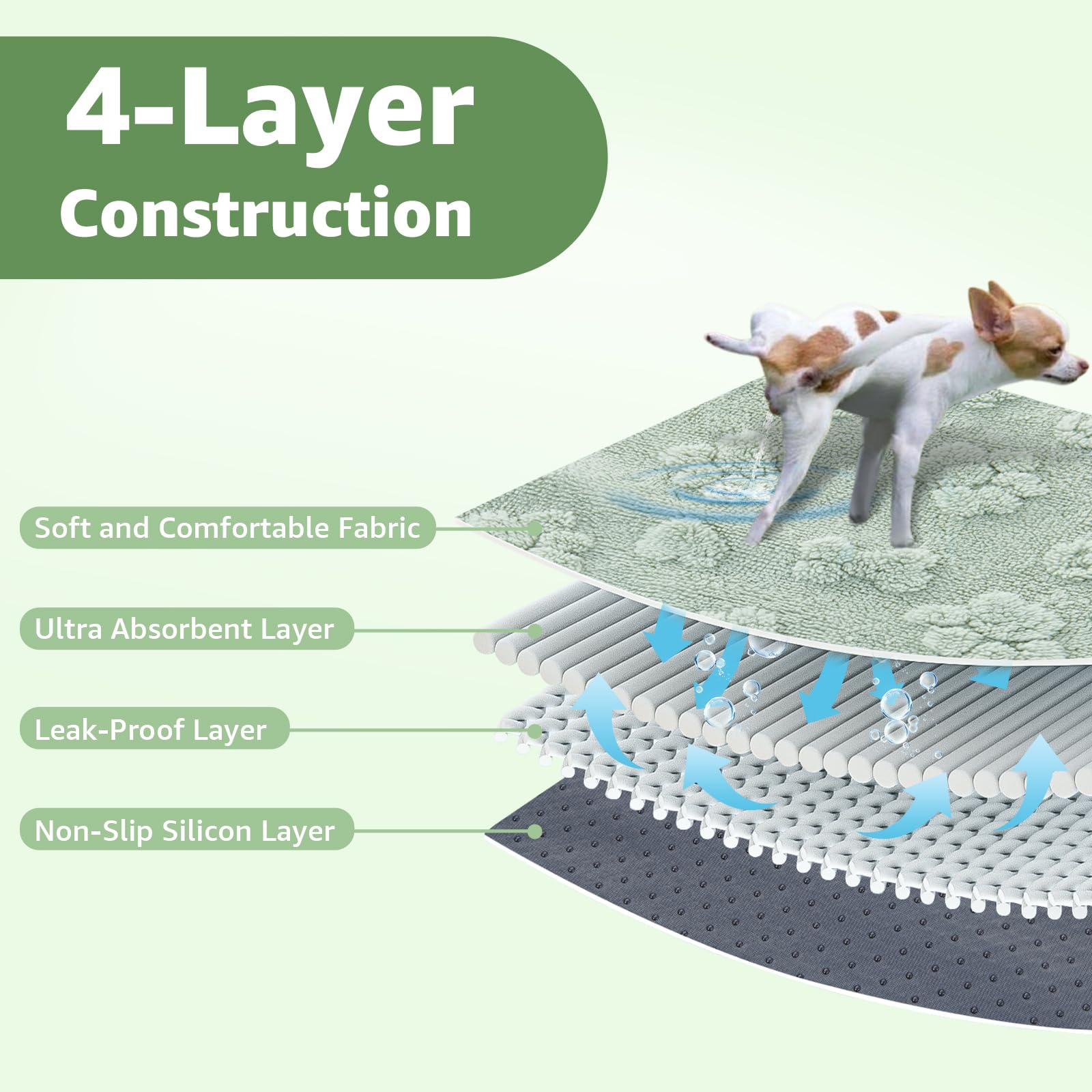 - Super Absorbent & Leak-Proof: With a soft and absorbent fabric top layer, washable puppy pads wick moisture away from the surface without the puddles stay on top of it. Keeps your floors dry and clean. The non-slip backing ensures the pad stays in place for added stability and safety