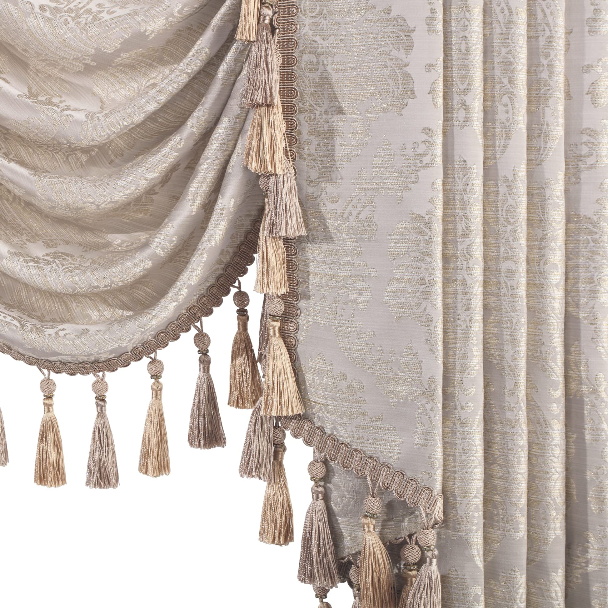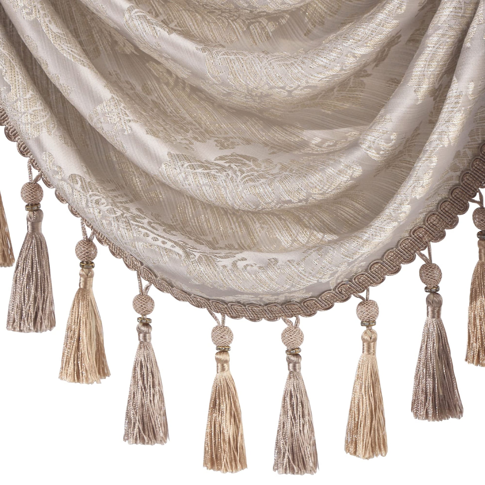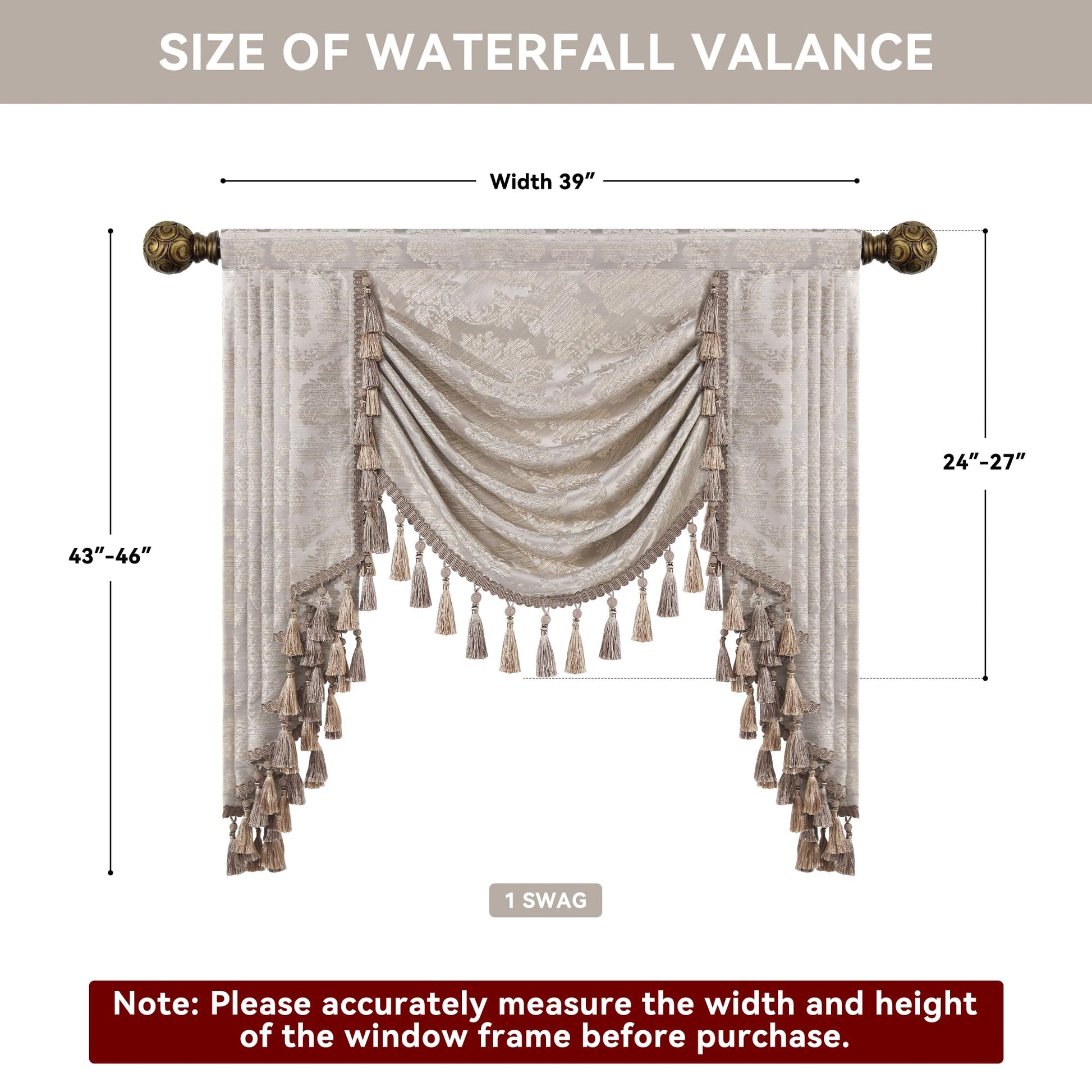 - ELEGANT WATERFALL VALANCE: Decorate your home window with this European style swag valance curtain. Features shiny damask frame jacquard pattern and woven with beige, silver and gold thread, this looks extra delicate and luxurioous. Accessorized with exquisite and flexible tassels, our floral window valances are good in drapability and will delivery elegant touch for your room.