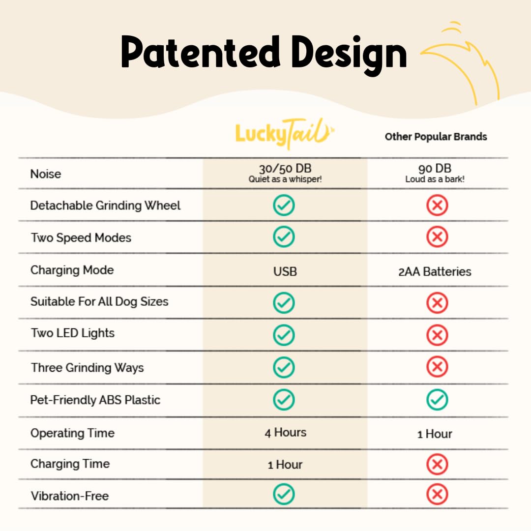- Patented Design: With our unique and innovative design, we created the gentlest and quietest electric nail grinder for dogs and cats. At 30 - 45 DBs our dog and cat nail grinder omits half the sound compared to popular competitors at 110 DBs. You and your furry bestie can finally say goodbye to stressful nail trims.