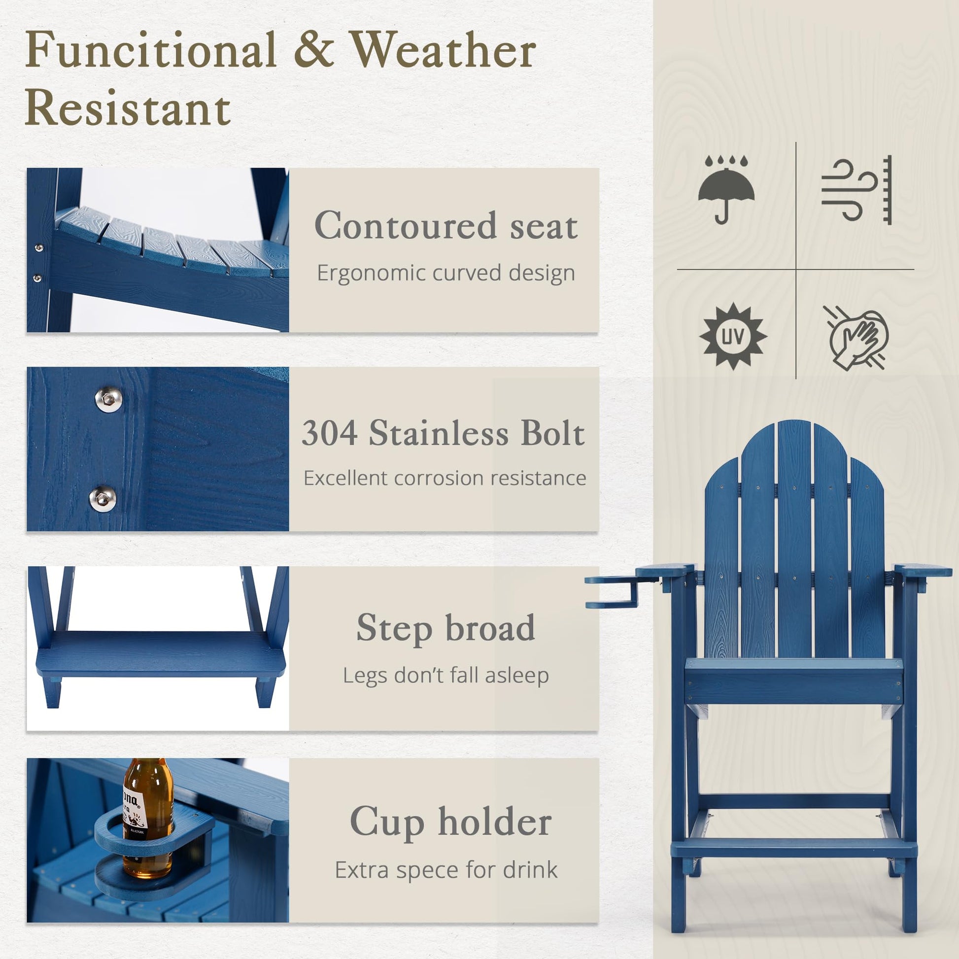 LUE BONA Tall Adirondack Chairs Set of 2, Recycled Poly Adirondack Chair Bar stools with Cup Holder, 25.6", 300Lbs, Eco-Friendly, Weather Resistant Lifeguard Chair for Balcony,Deck