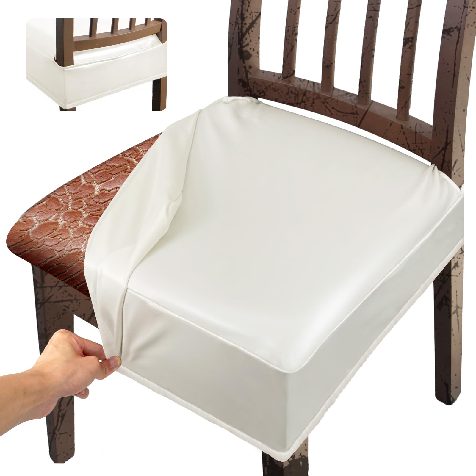 Lufyzora Leather Seat Covers Dining Chairs Waterproof Kitchen Chair Seat Covers Set of 2, Wipeable 4-Sided Super Elastic PU Chair Covers Dining Chairs for Dining Room and Dust Resistant(Cream, 2PCS)