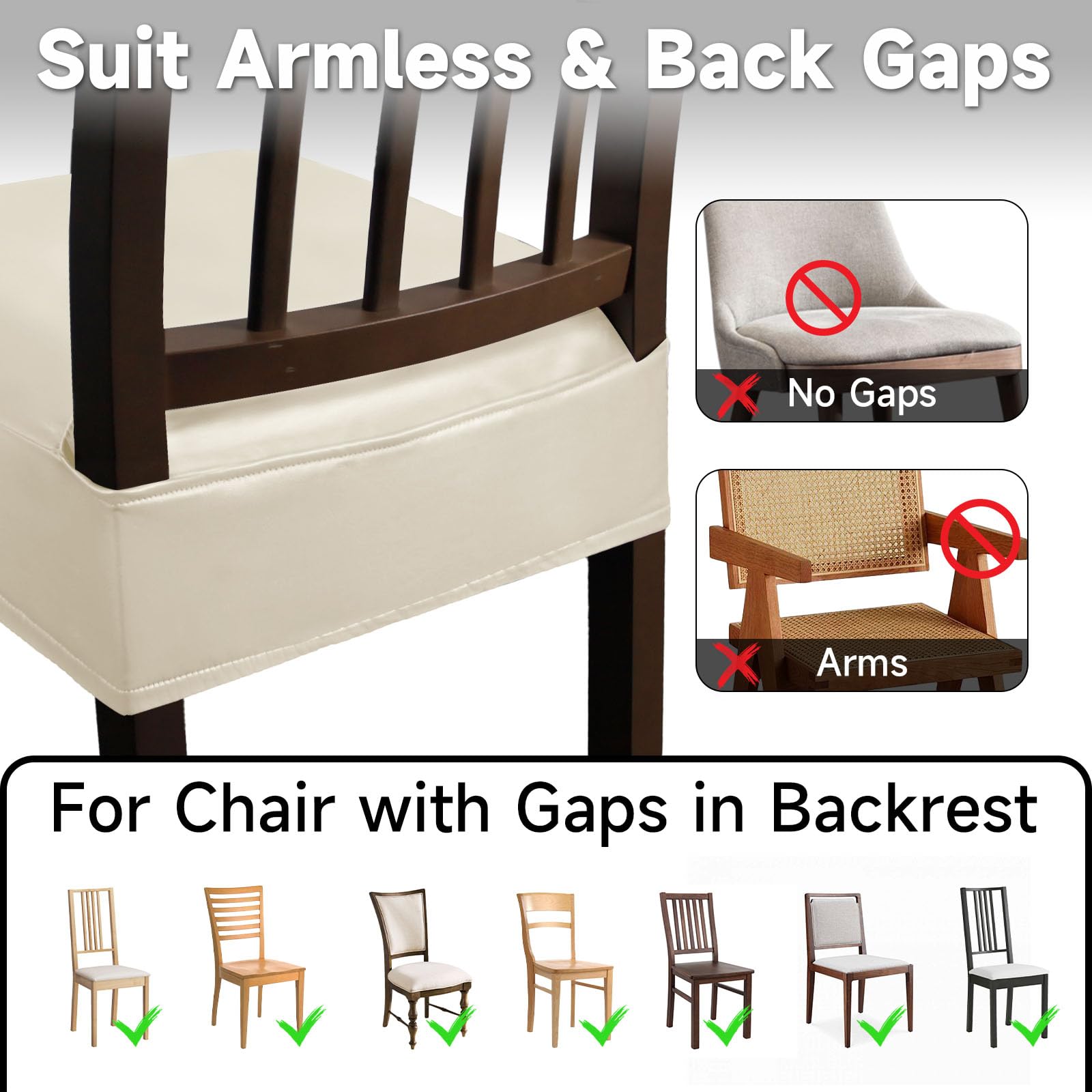 - Easy to Install: Waterproof seat covers dining chairs are suitable for chairs with gaps in the backrest, not suitable for chairs with armrests and chairs with no gap in the back. The unique design is quick and easy to install, and there is no need to remove the cushion, simply slip the cover on