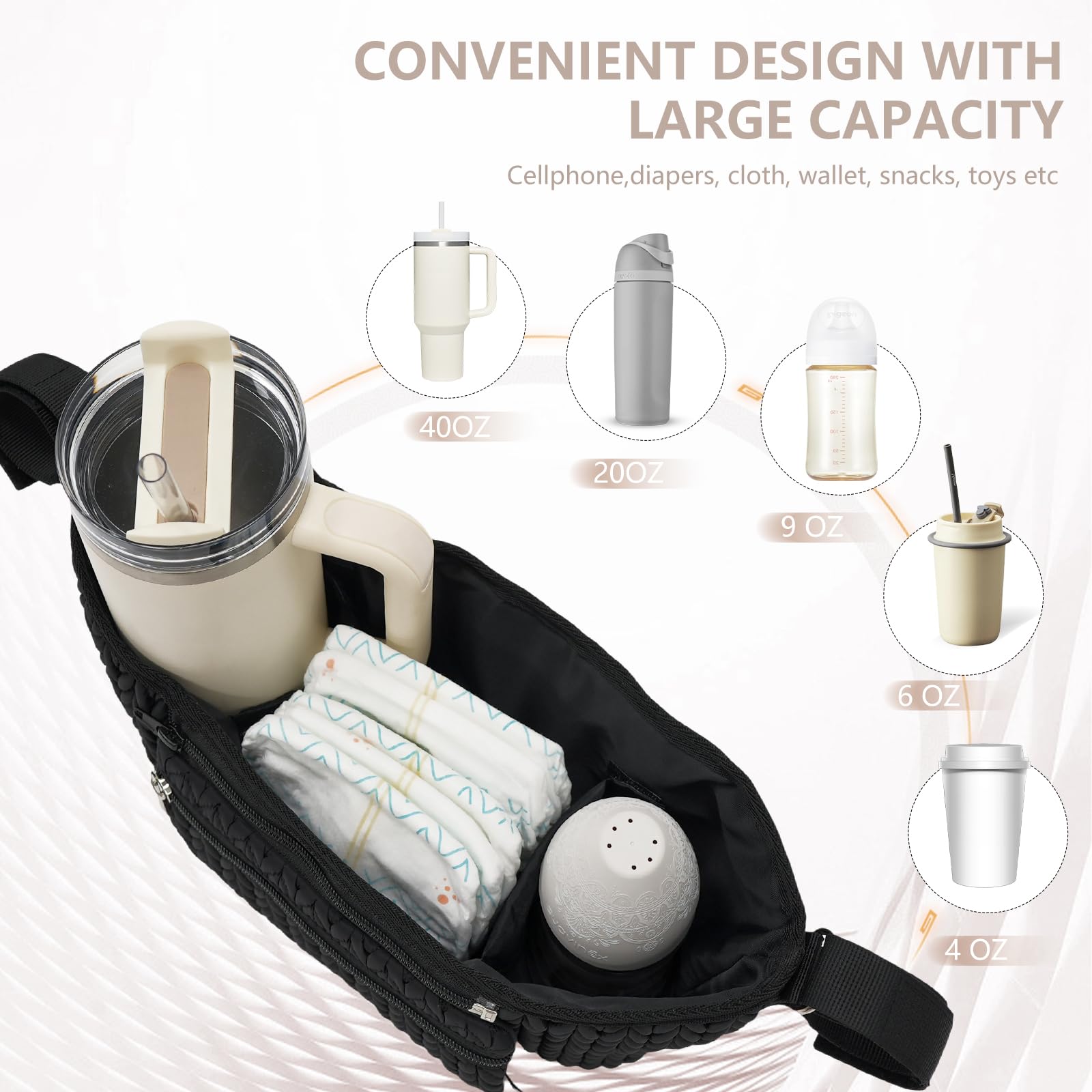 - * Universal Fit - Easily attaches to most stroller handles, ensuring you're always prepared for adventures with your baby. Your phone, coffee tumbler, and baby supplies will always be convenient.