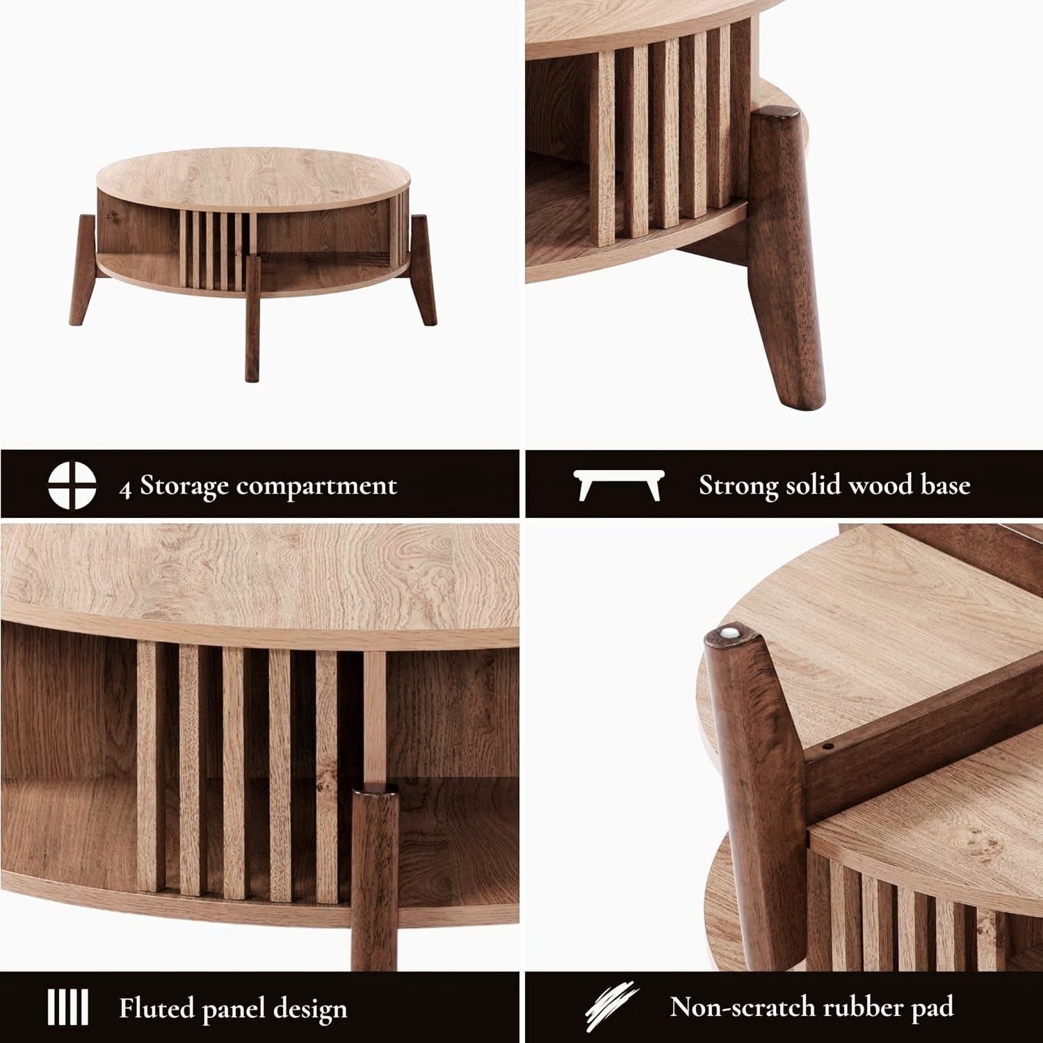 - Mid-Century Coffee Table with Storage: This 31.5” round coffee table features a textured oak wood grain finish and solid rubberwood legs, adding a stylish mid-century touch to your space. Its versatile design complements various living room furniture and decor.