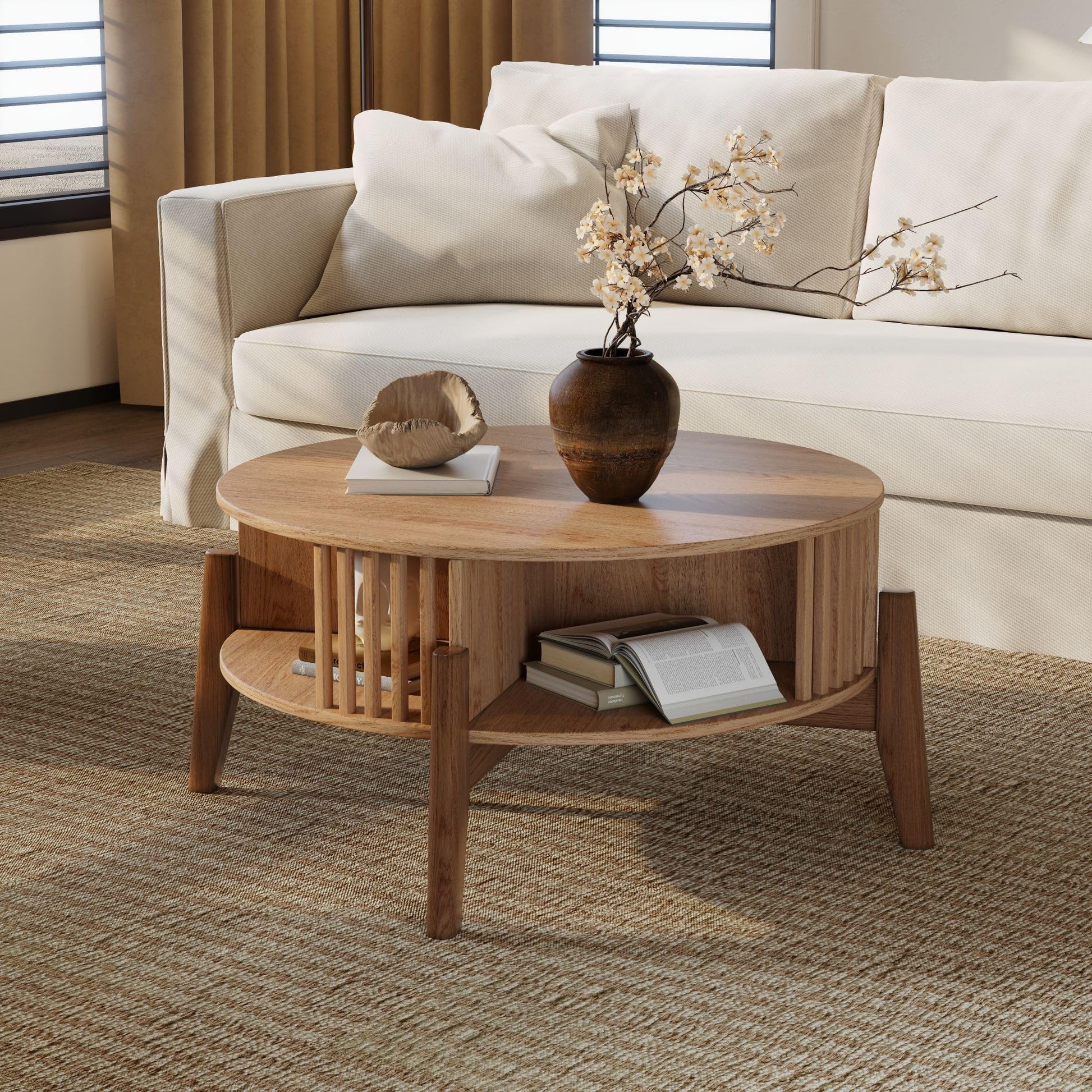 LuxenHome Round Coffee Table with Storage, 31.5" Oak Finish Wood Accent Tables with Wood Legs, Boho Center Table for Living Room, Wooden Circle Coffee Table with Open Storage for Home Office