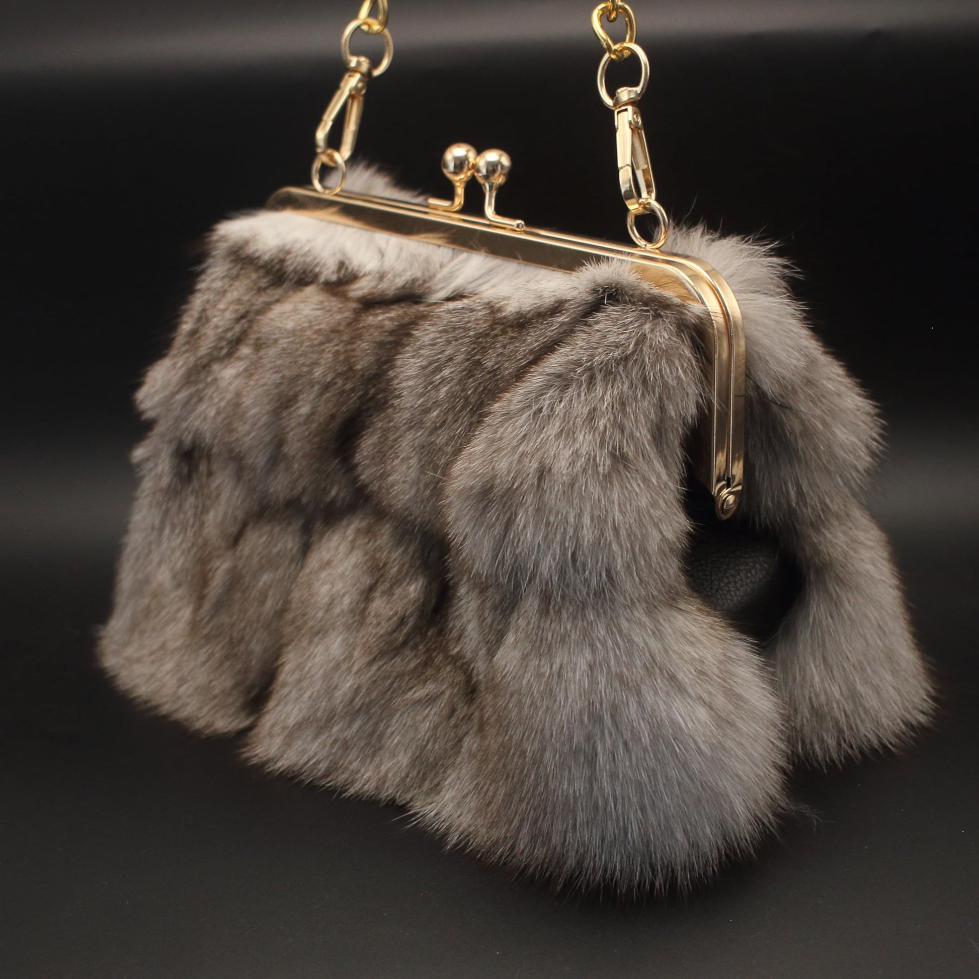 Luxurious Fashion Natural Fox Fur with Hair Handbag for Women and Ladies (White, Small) (Gray)