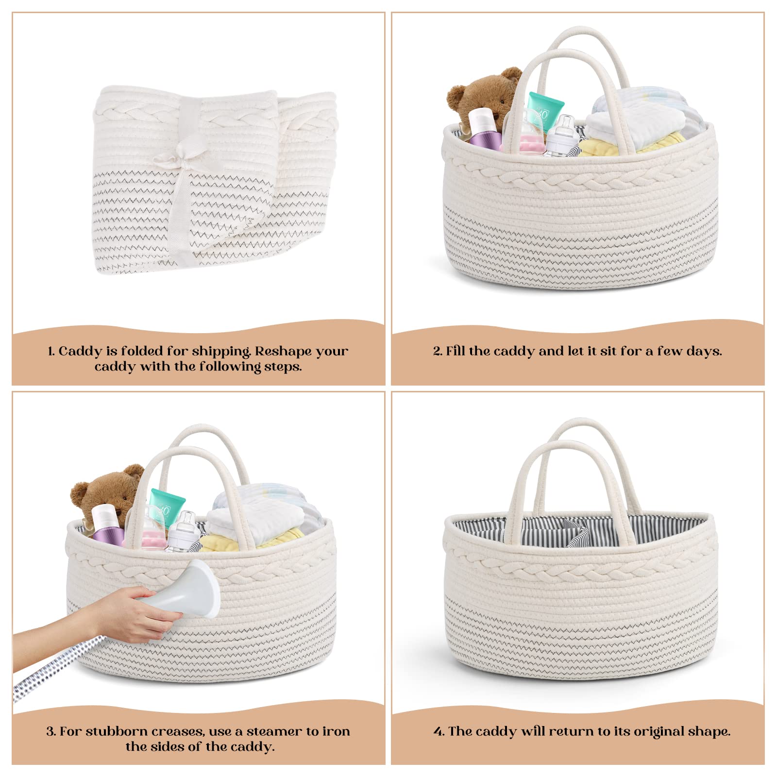 - Portable Baby Caddy: The multi-functional basket organizer features long and durable handles. The portable diaper caddy can also be folded for compact storage in your suitcase or backpack when on the move