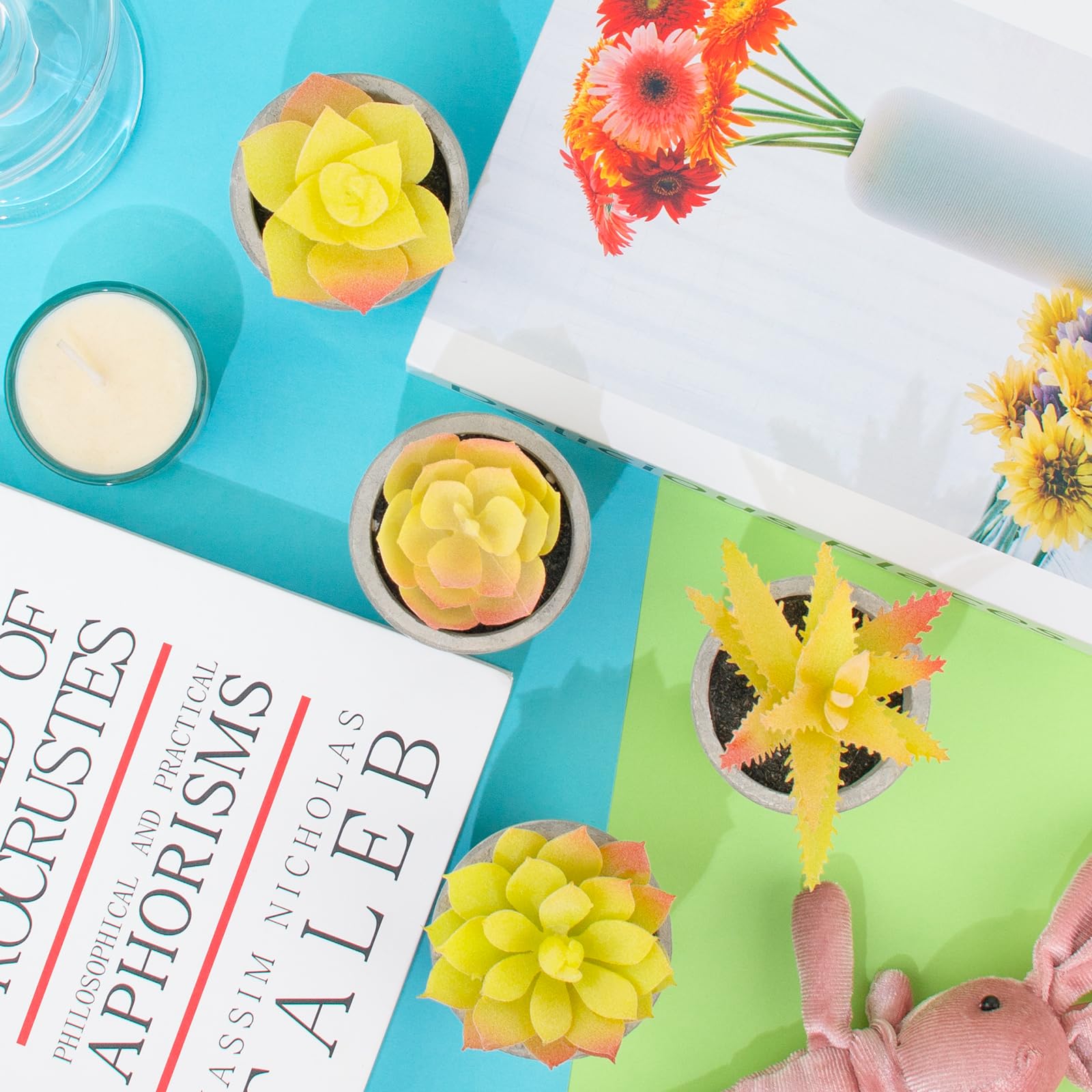 - CONVENIENCE AND LONGEVITY : The mini fake succulents with pulp pot will add fresh feelings to your bookcase. Decorative faux succulent doesn't need any watering or sunshine and accompany you for a long time !