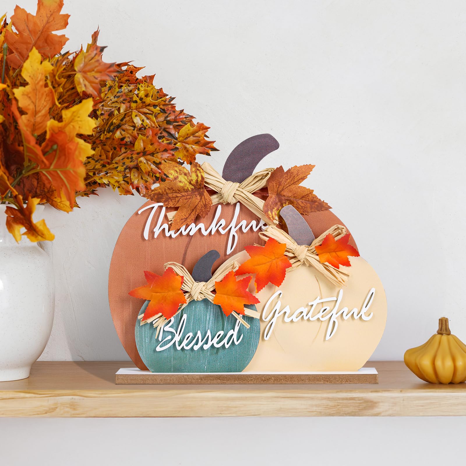 - Unique Fall Wooden Decor: Elevate your autumn decor with this one-of-a-kind wooden centerpiece featuring three charming pumpkin-shaped plaques in orange, white, and green. Pumpkins with the 3D letter Blessed Grateful Thankful, which give your house a fall and Thanksgiving Day atmosphere