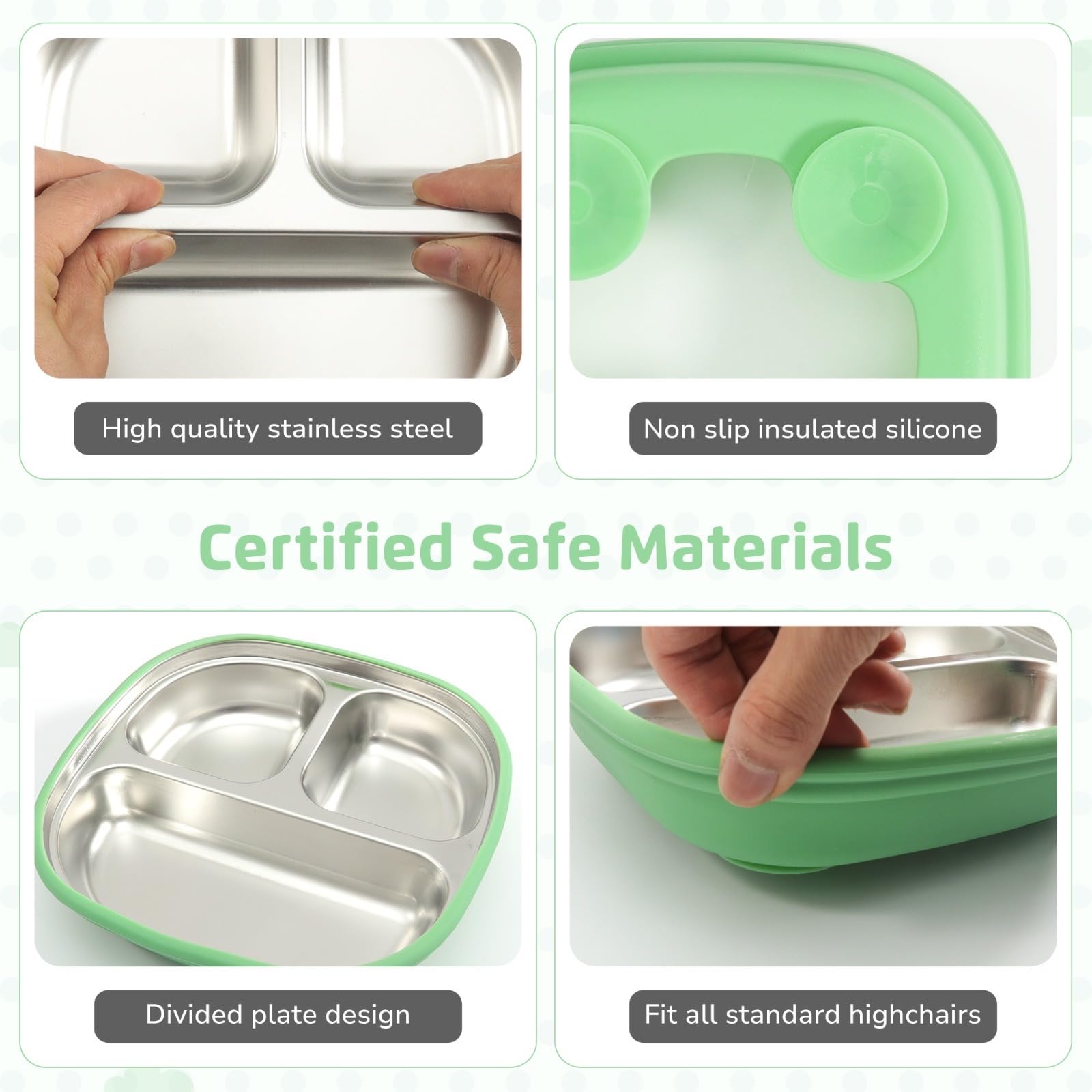 - Safe/Sturdy for Little Hands: Crafted from food-grade stainless steel and wrapped in soft, BPA-free silicone, our stainless steel kids plates ensures durability. With smooth edges, it's gentle enough for toddlers but tough enough to withstand mishaps.