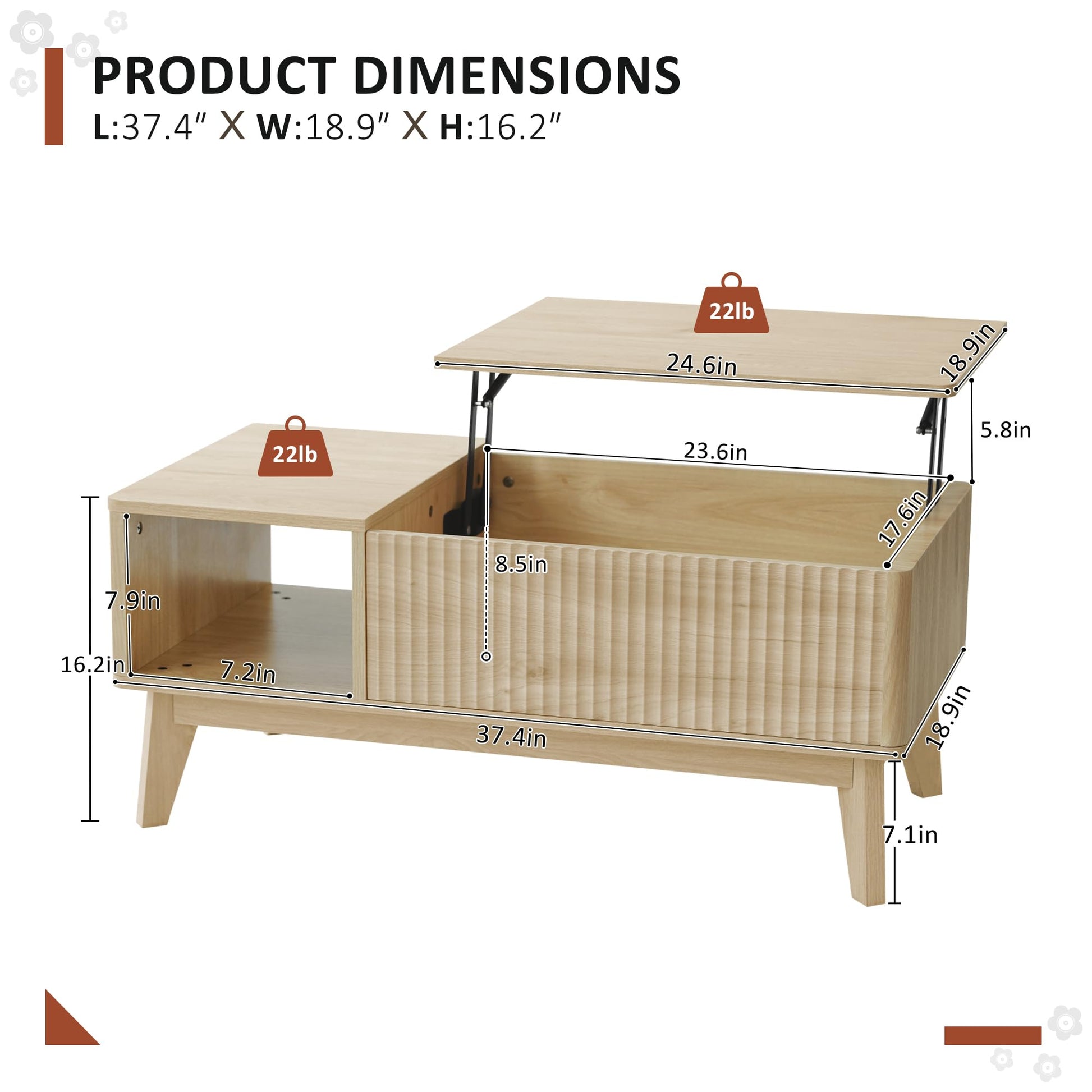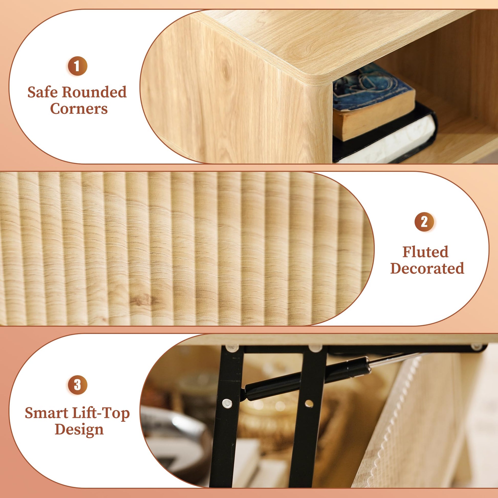 LYNCOHOME Fluted Lift Top Coffee Table with Hidden Compartment, Modern Center Table for Living Room, Home Office, Natural