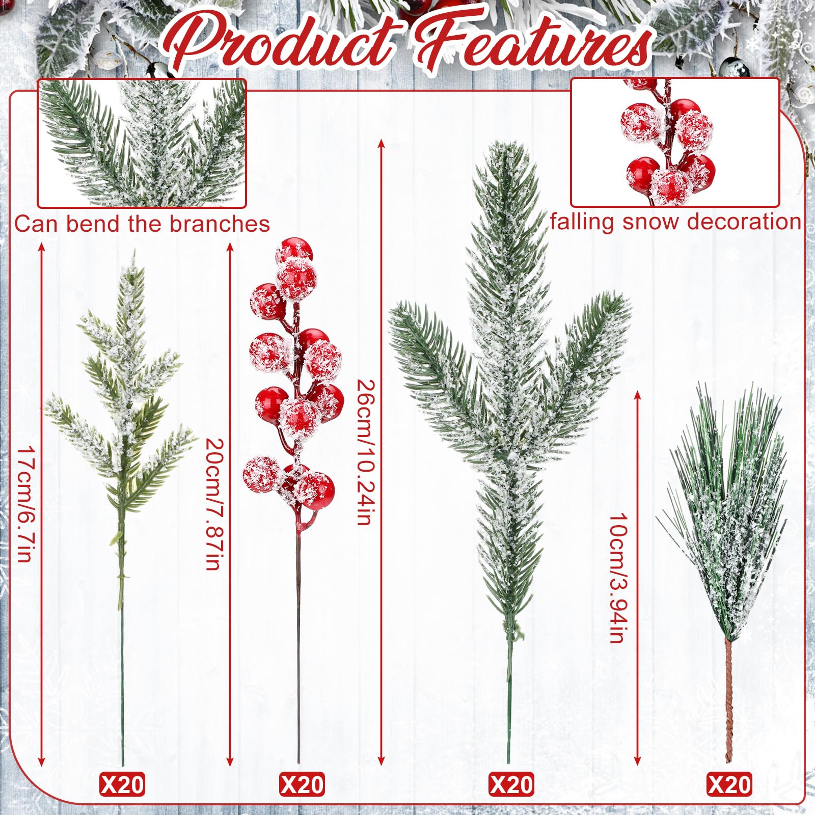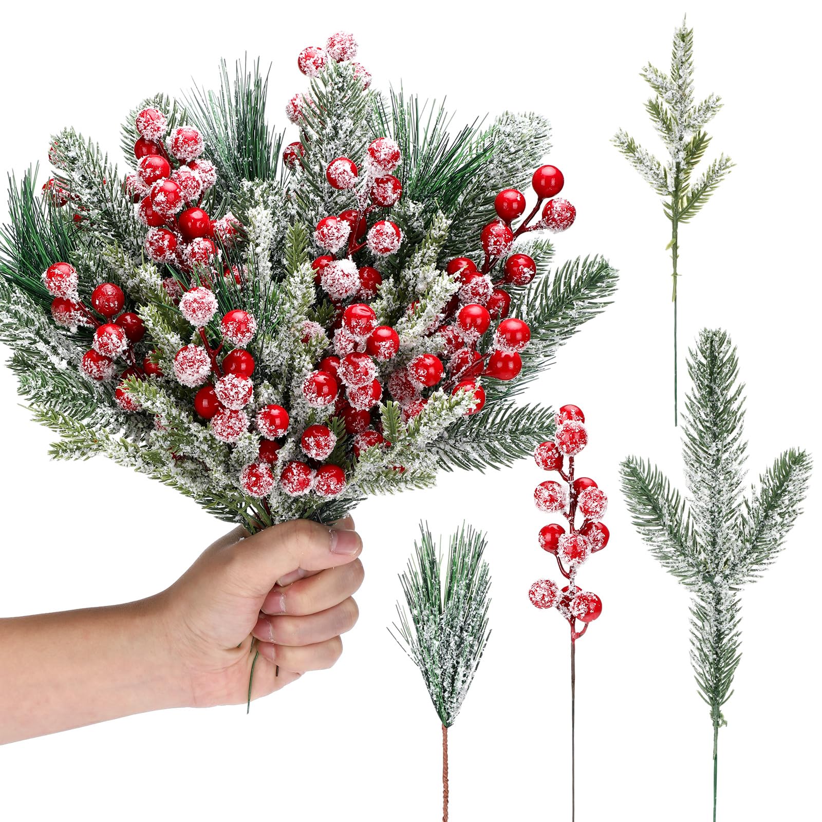 Lyrow 80 Pieces Christmas Snowy Pine Tree Picks Artificial Berry Stems Sprays Faux Cedar Pine Needles Branches for Holiday Arrangement Wreath DIY Garland Holiday Decor Winter Greenery (Red)