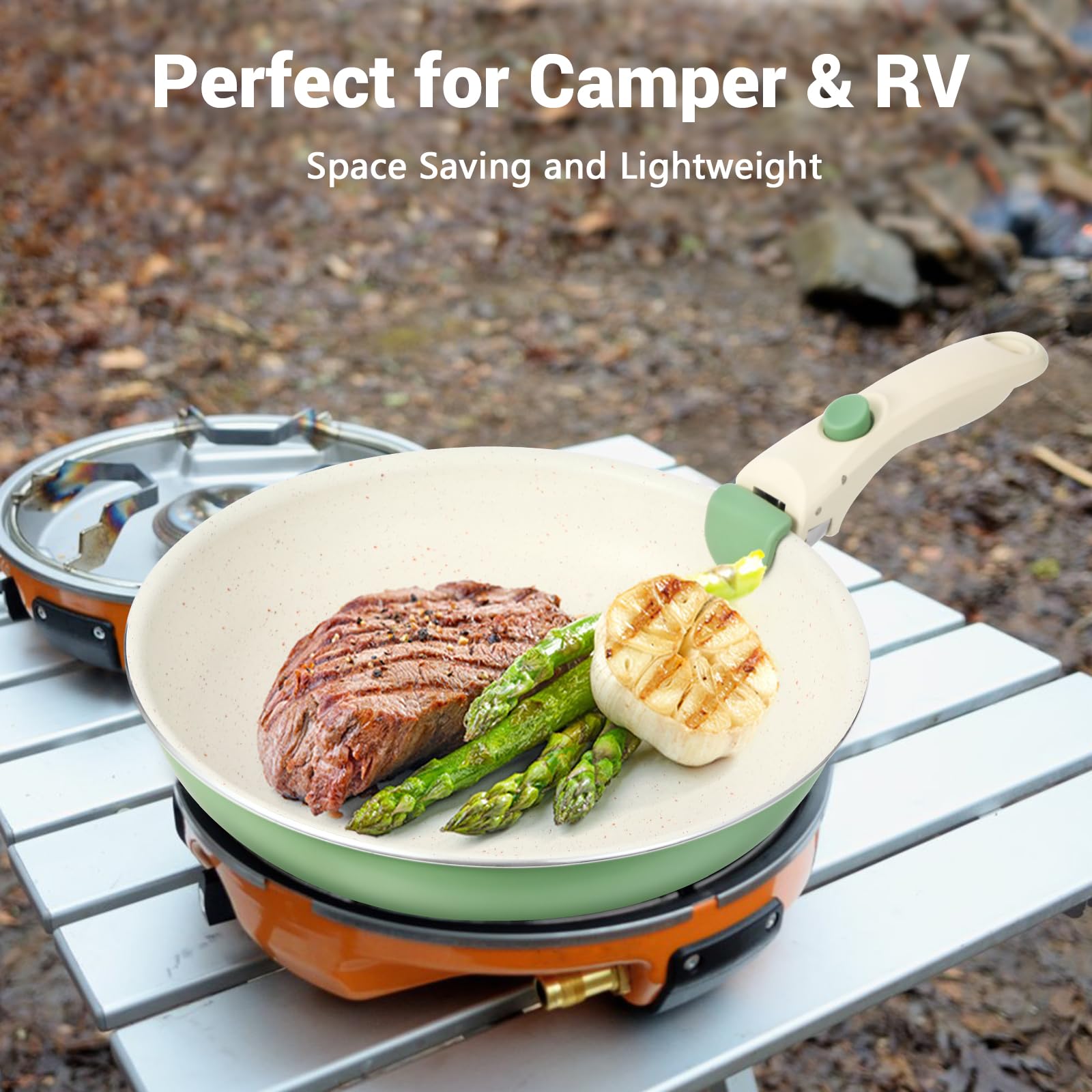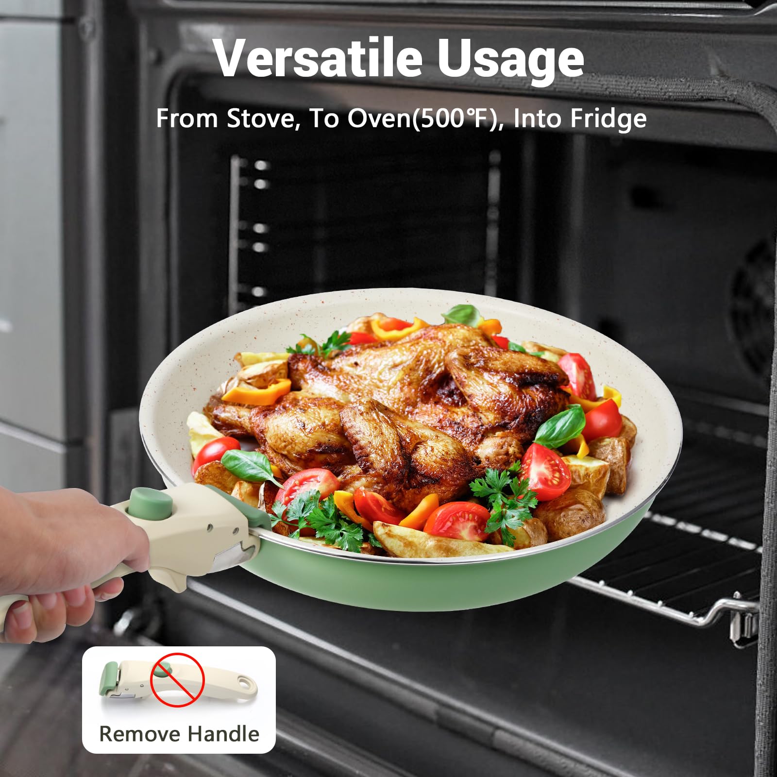 - 【Easy 'CLICK' Detachable Handle】This nonstick pot and pan set comes along with upgraded removable handle - 'CLICK' on and off easily again and again, providing a secure grip when needed and freeing up space when stored