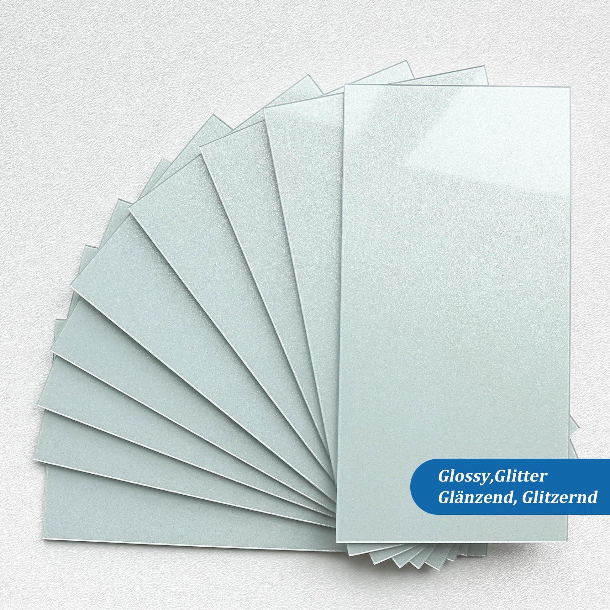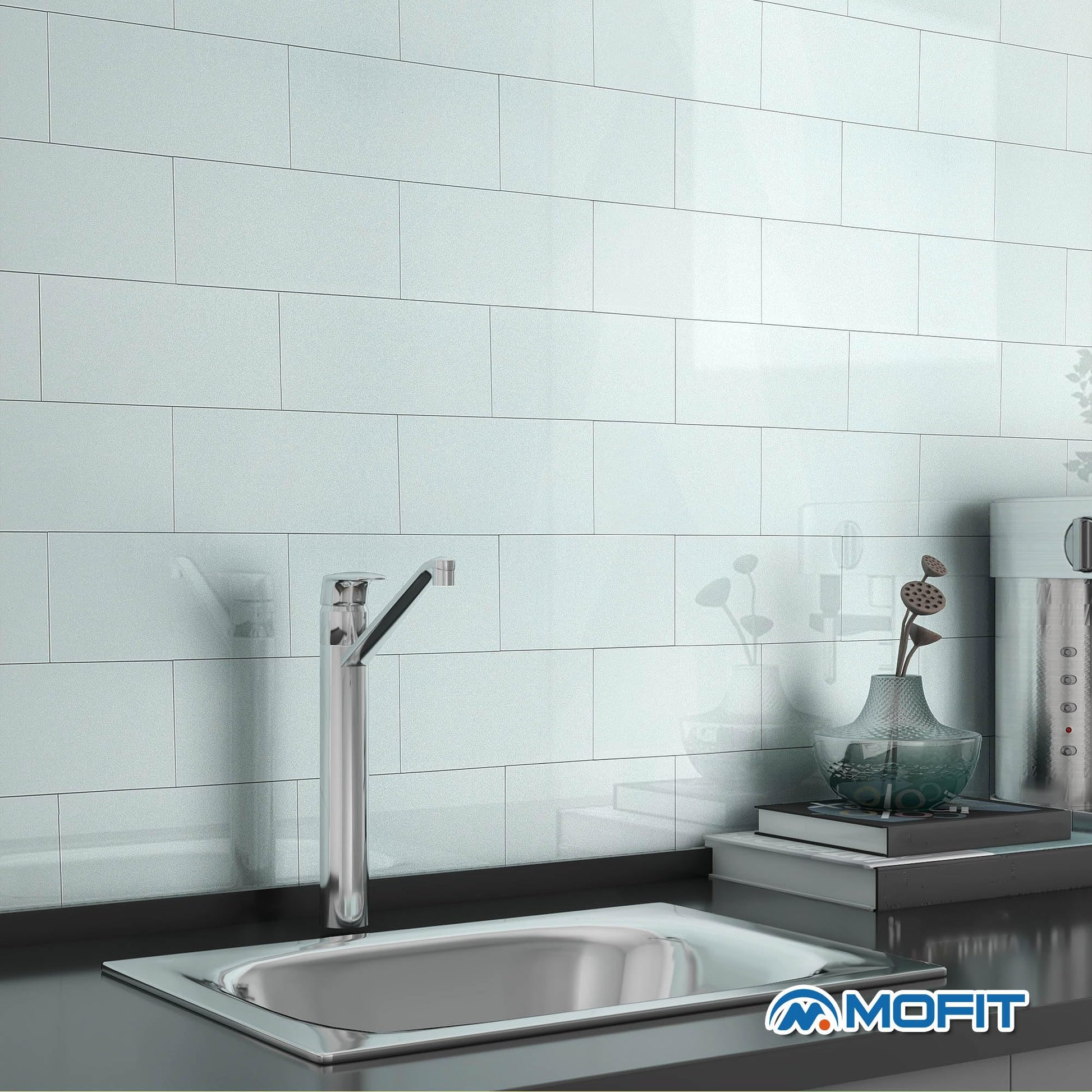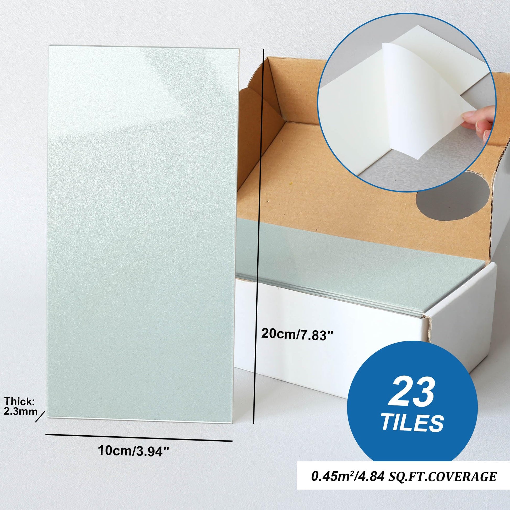 - SUBWAY PEEL AND STICK BACKSPLASH: M MOFIT sleek large subway tile stickers are self adhesive wall tiles with a realistic glass tile effect, made of durable resin material,high glossy finish, glitter color,feature a high-end surface and a sturdy body.Large wall tiles Individual measures CM 10 x 19.9, 2.3 mm thick, each box contains 23 tiles, total coverage of 0.45 square meters