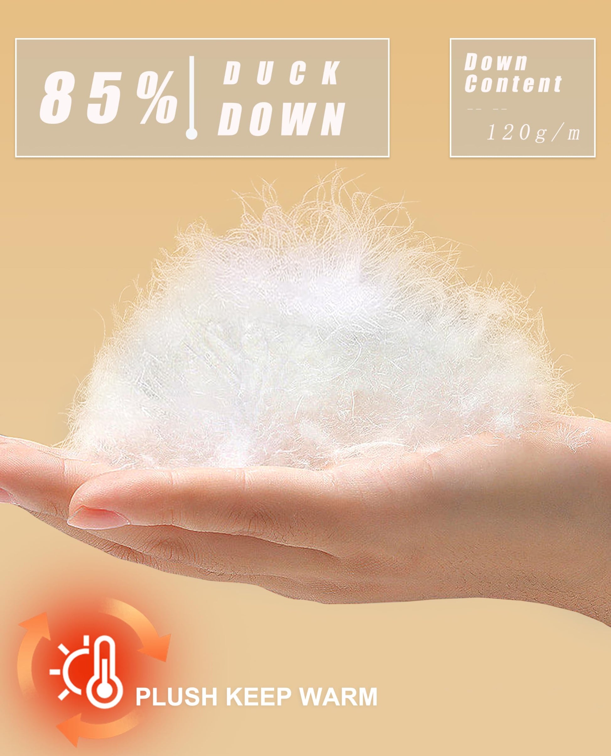 - [Material]: Shell: Polyster; Content:85% Duck Down and 15% Feather; Down Content:120 g/m. Comfortable, Warm Padded, Windproof, Water-Resistant.