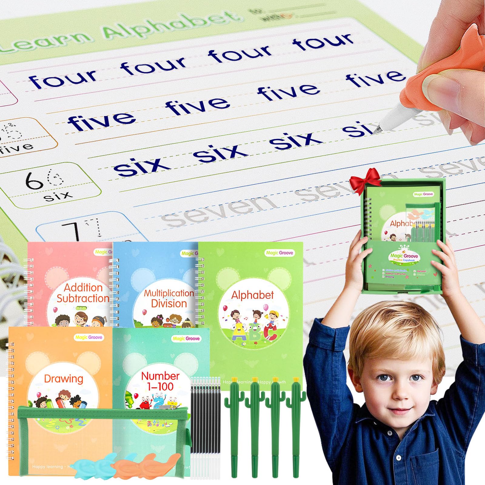 - 【5 in 1 Magic Practice Copybooks】BYFWH Reusable Handwriting Practice Book contains 5 different Grooved Handwriting Workbooks (Addition and Subtraction, Multiplication and Division, Numbers, Alphabet and Drawing), 4 cute cactus pens, 4 pen holding aids,10 pen refills,1 pen bag and a gift box for easy storage. Provide children with different learning options and let them experience the fun of writing from learning.