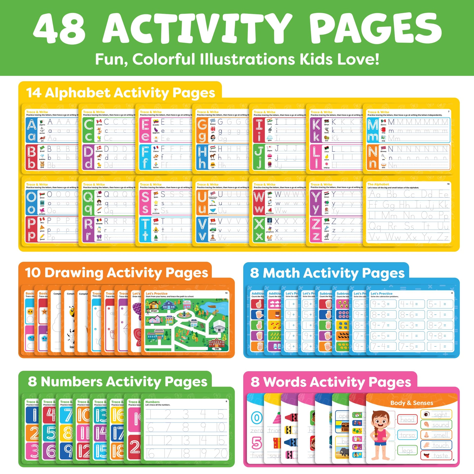 - 48 Fun Learning Activities Across 5 Large Tracing Books For Kids. A wide variety of activities are included in reusable grooved handwriting workbooks. Topics include: Alphabet, Drawing, Math, Numbers & Words. These grooved writing books for kids engage focus, develop multiple cognitive skills and immerse kids in a world of fun & learning! Watch them master words, numbers, addition, subtraction, drawing, etc through grooved letter tracing for kids. A homeschool preschool must have to improve calligraphy and writing skills.