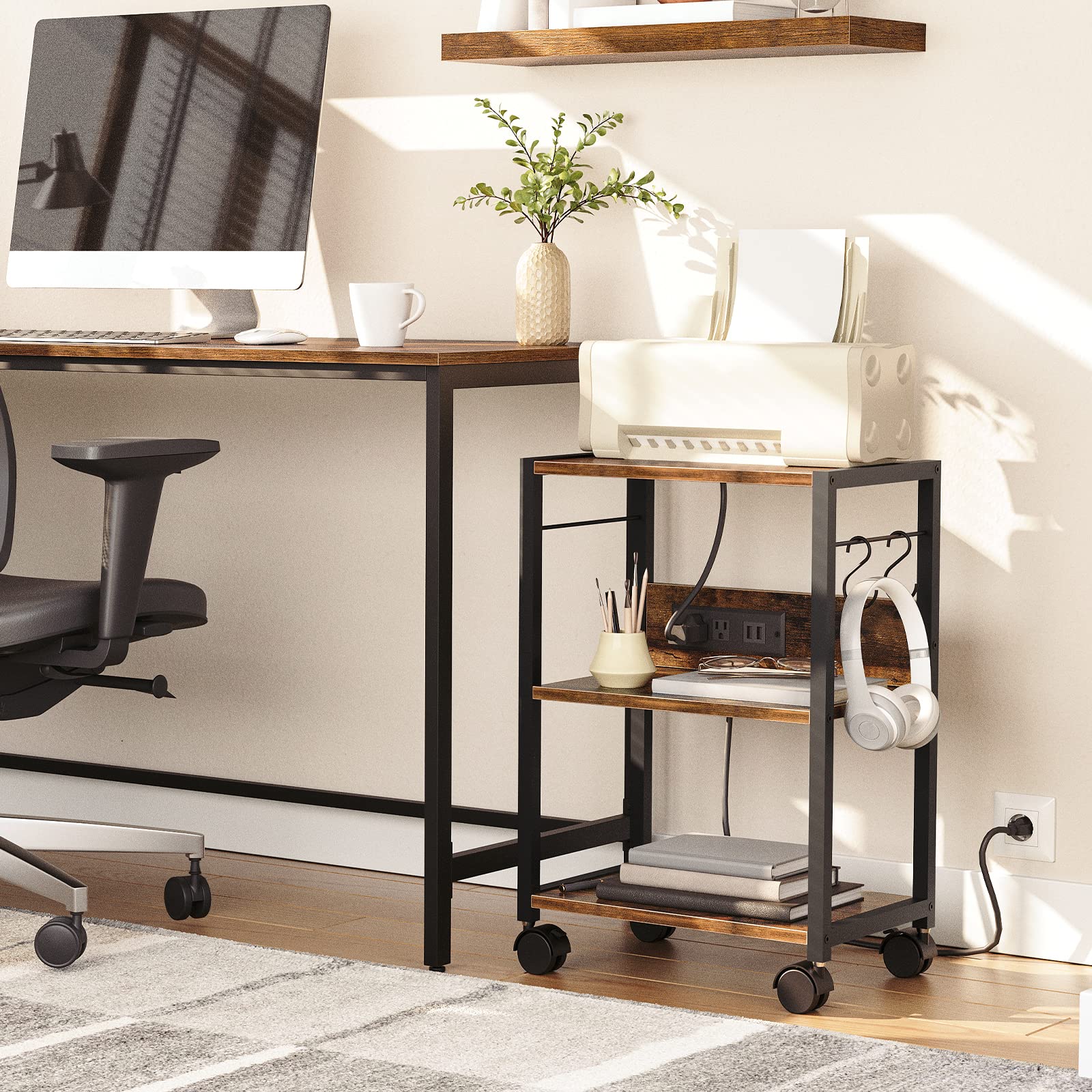 MAHANCRIS Industrial Printer Cart, 3-Tier Mobile Printer Stand, Rolling Cart with Power Outlets and USB Ports, Home Printer Stand with 2 Hooks, for Office, Living Room, Rustic Brown PTHR40E01Z