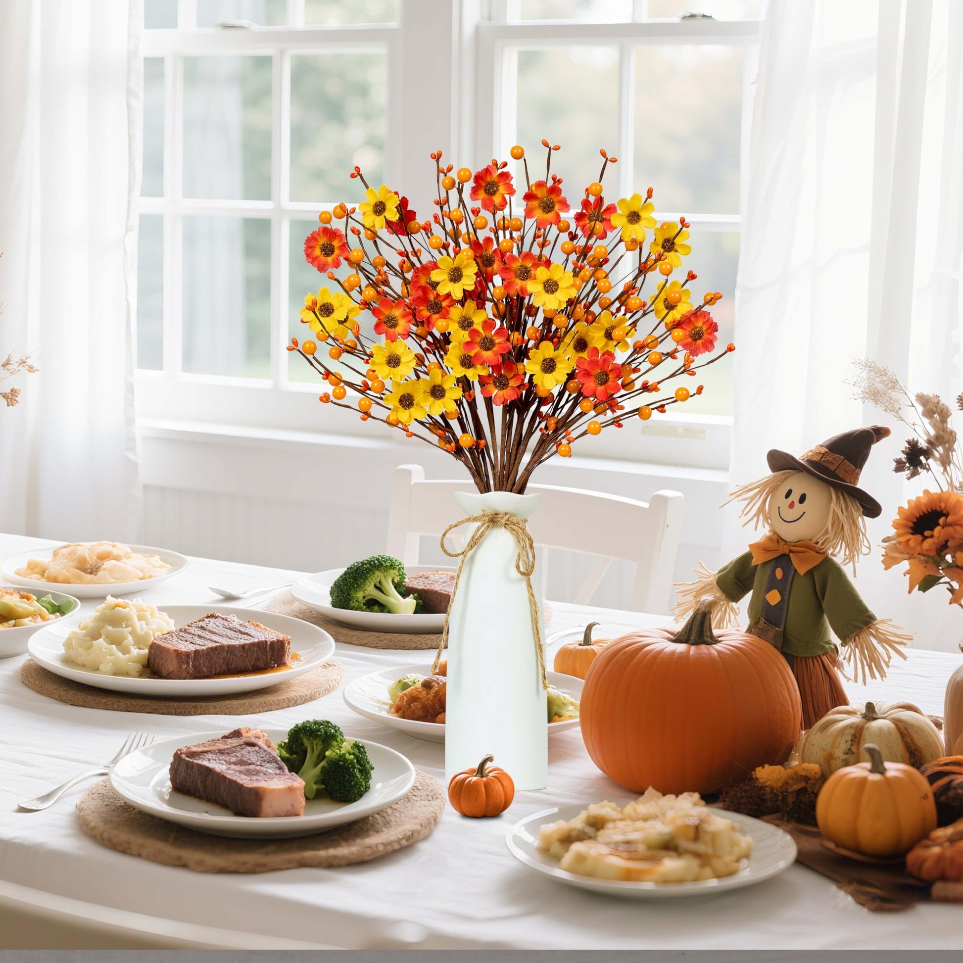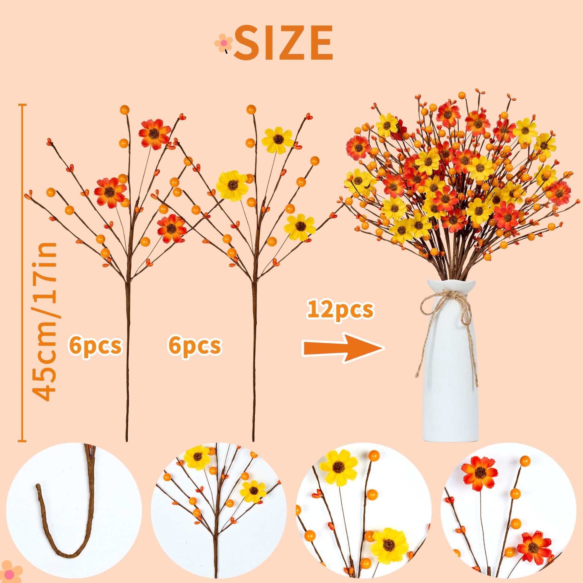 - Size and Quantity:There are 12 Fall Picks artificial floral stems in the package, consisting of 6 orange daisy stems and 6 yellow daisy stems, each fall berry stems measures 17 inches