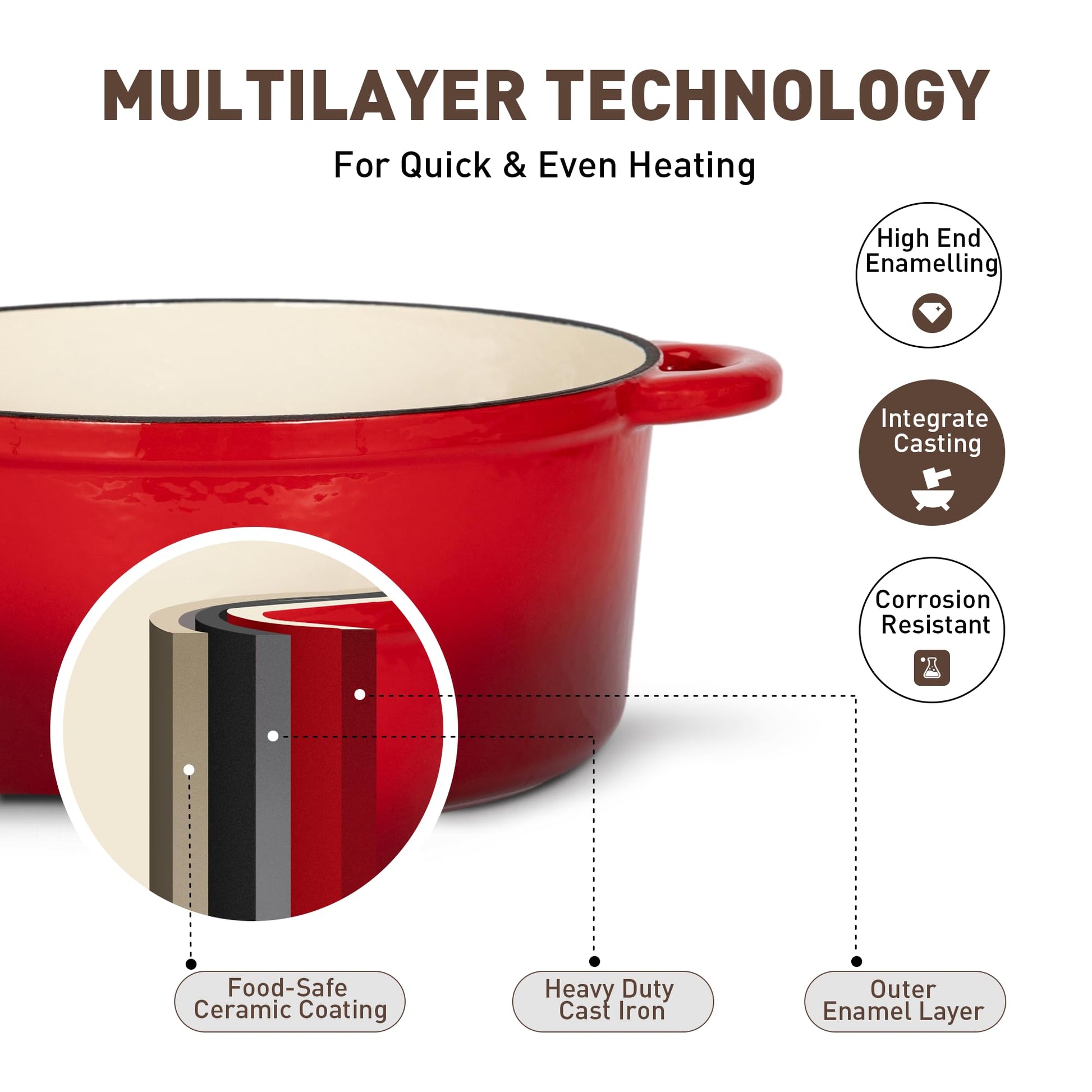 MAISON ARTS Enamel Cast Iron 7 Piece Cookware Set, Heavy Duty Dutch Ovens Pot with Lid, Red Non Stick Pots and Pans Sets, Oven Safe up to 500°F