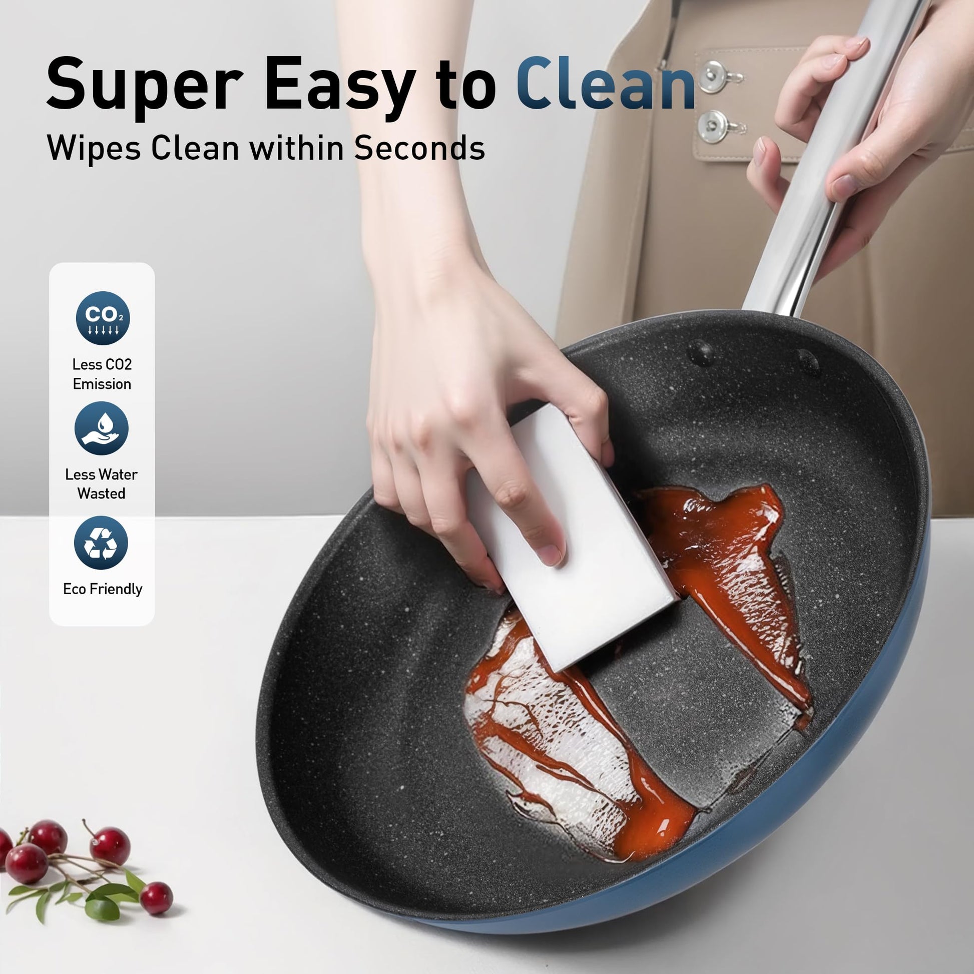 - 【Scratch-Resistant】: Titanium coating can withstand regular use and high temperatures without wearing off or losing its non-stick properties. Whatever cookware you use, we always recommend plastic, silicone, or wood utensils to prolong the lifespan of the cookware