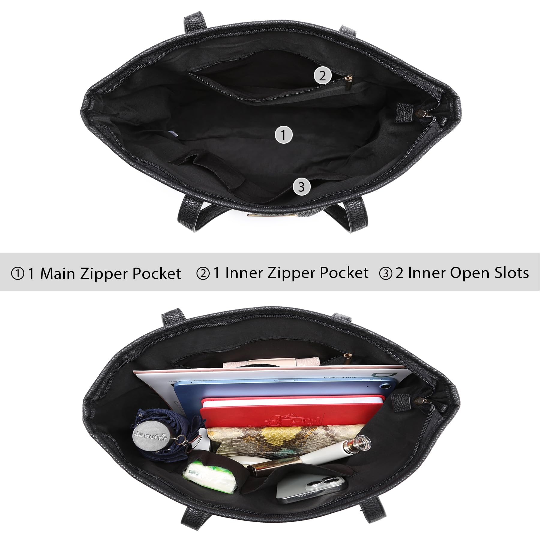 - Large Capacity: Large Tote handbag - 1 main zipper compartment with 1 inner zipper pocket & 2 slot pockets. It' big enough to hold your daily supplies, like Ipad, notebook, umbrella, water bottle, document and all your essentials. Crossbody bag - 1 inner pocket with 1 zipper pocket. Wallet card holder-1 inner zipper pocket & 8 card slots.