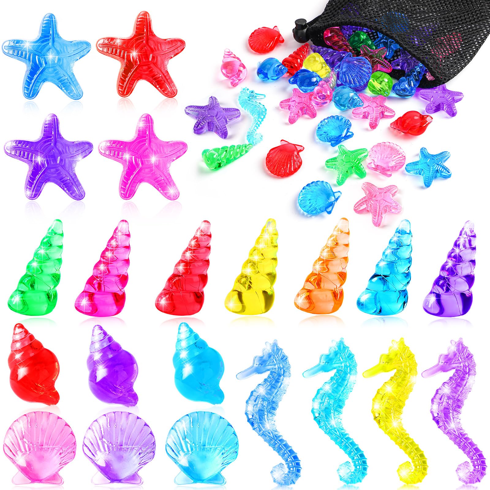 MARFOREVER 36 PCS Acrylic Seashells Dive Toys Shell Gems Pool Starfish Conch Scallop Gemstones Pirate Treasures for Beach Underwater Throw Game Toys Swimming Training Summer Mermaids Party Favors
