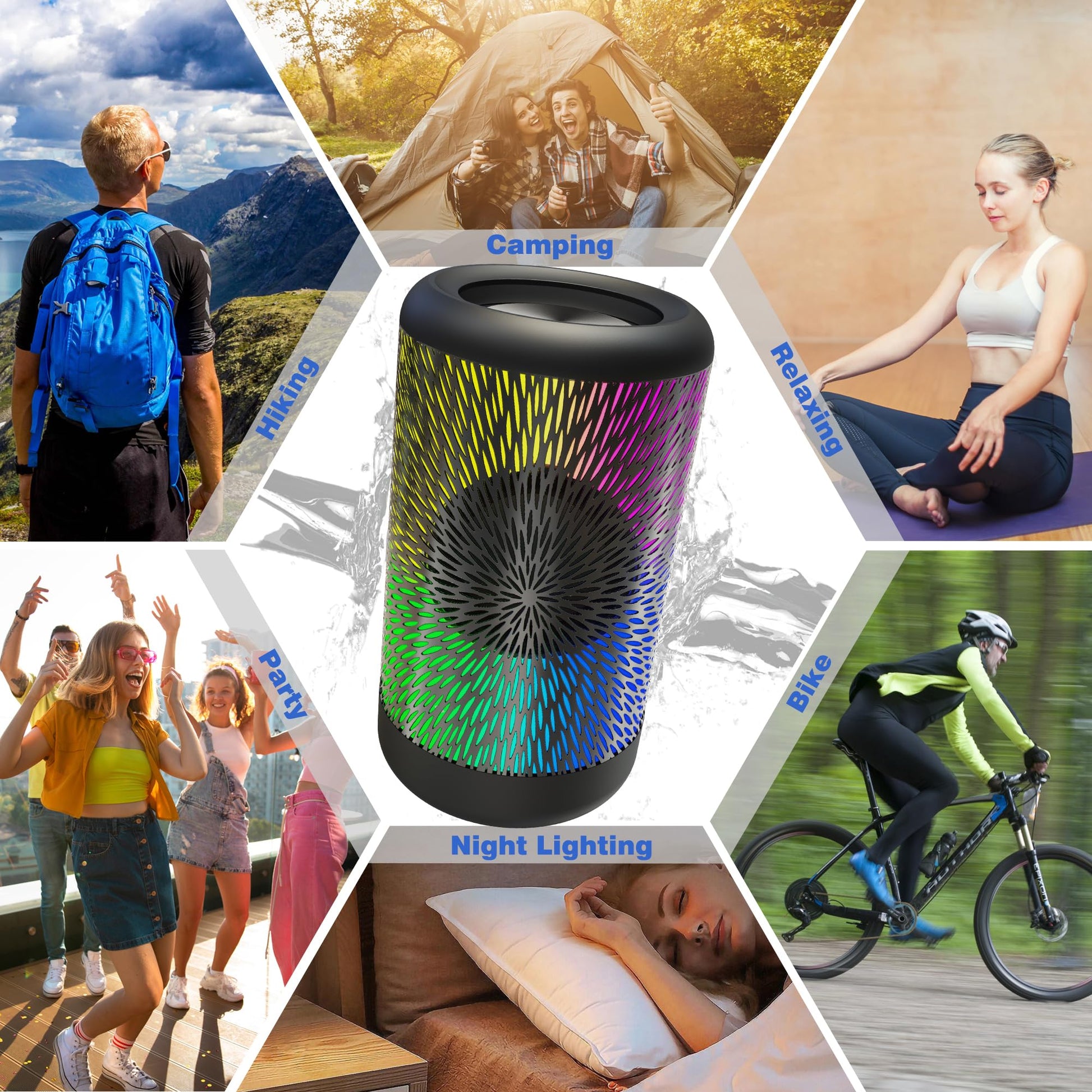 - [5 Stunning Lighting Modes for Perfect Ambiance]: Equipped with 5 lighting modes: steady light, rhythm mode, yellow light, blue light, and red light. Whether it’s for party, relaxation, or cozy moments, this mini bluetooth speaker delivers both visual and auditory enjoyment, the light show can sync with the music beat