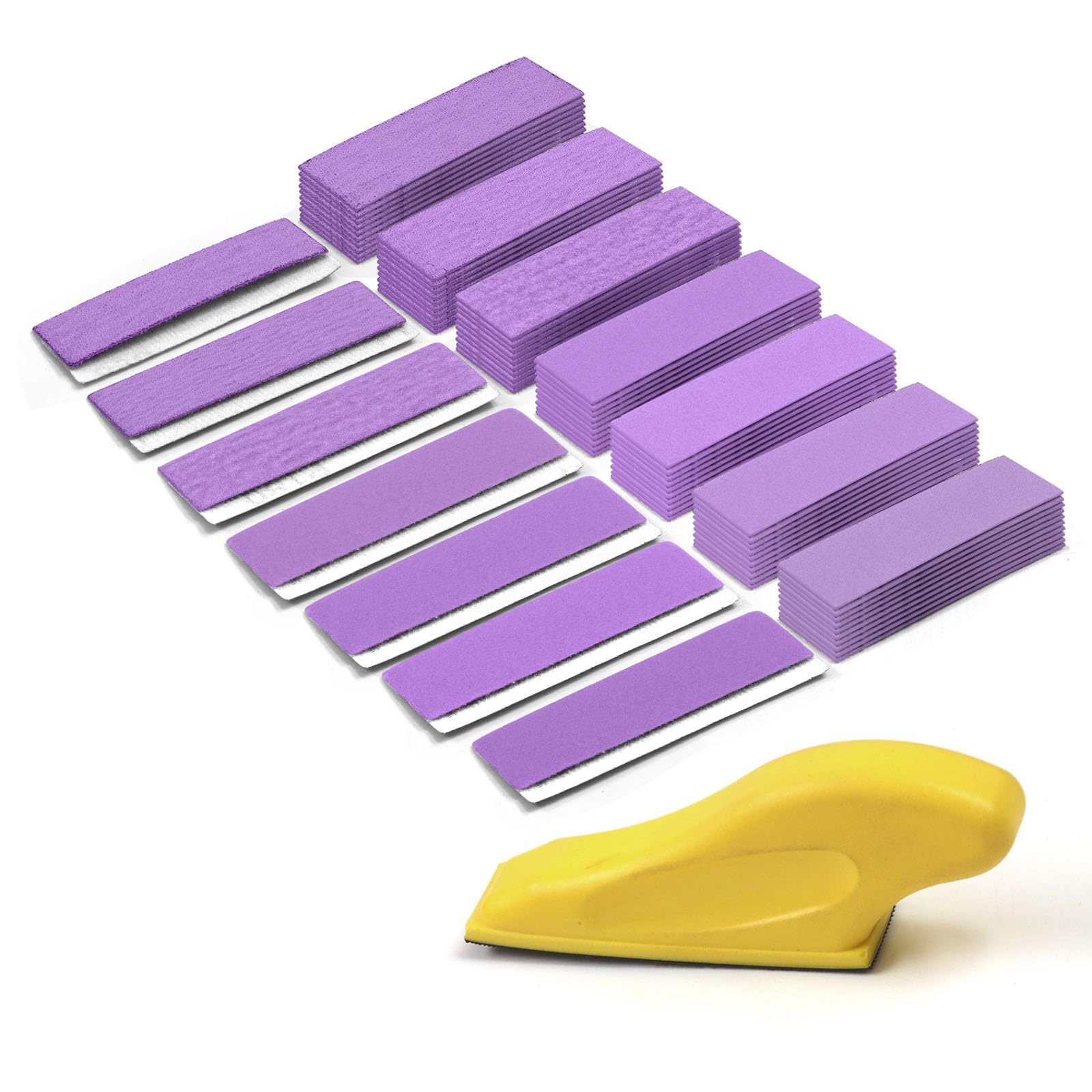 MAXMAN 70 Sheets Micro Detail Sand Paper Kit, 3.5”x 1”Hand Sanding Block for Small Projects Wet Dry Hook & Loop Alumina 80 to 600 Grit Sandpaper for Wood Crafts, Tight Narrow Spaces Metal Finishing