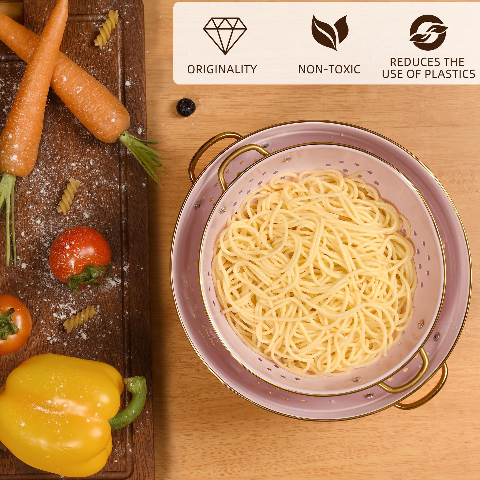 Metal Colander Set of 2, Strainer Basket with Handles 3.5 & 5 Qt Powder Coated Self-draining Solid Ring Base Metal Large Kitchen Colander Bowel for Pasta Vegetable Fruit (PINK)
