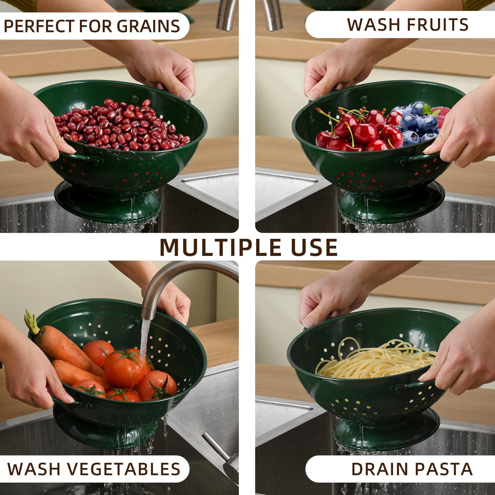Metal Colander Set of 3, Strainer Basket with Handles perfect for Spaghetti, Pasta, Berry, Vegetable, Fruit, Solid Base Powder Coated Kitchen Essential Strainer Set, 1 & 3.5 & 5 Qt (Dark Green)