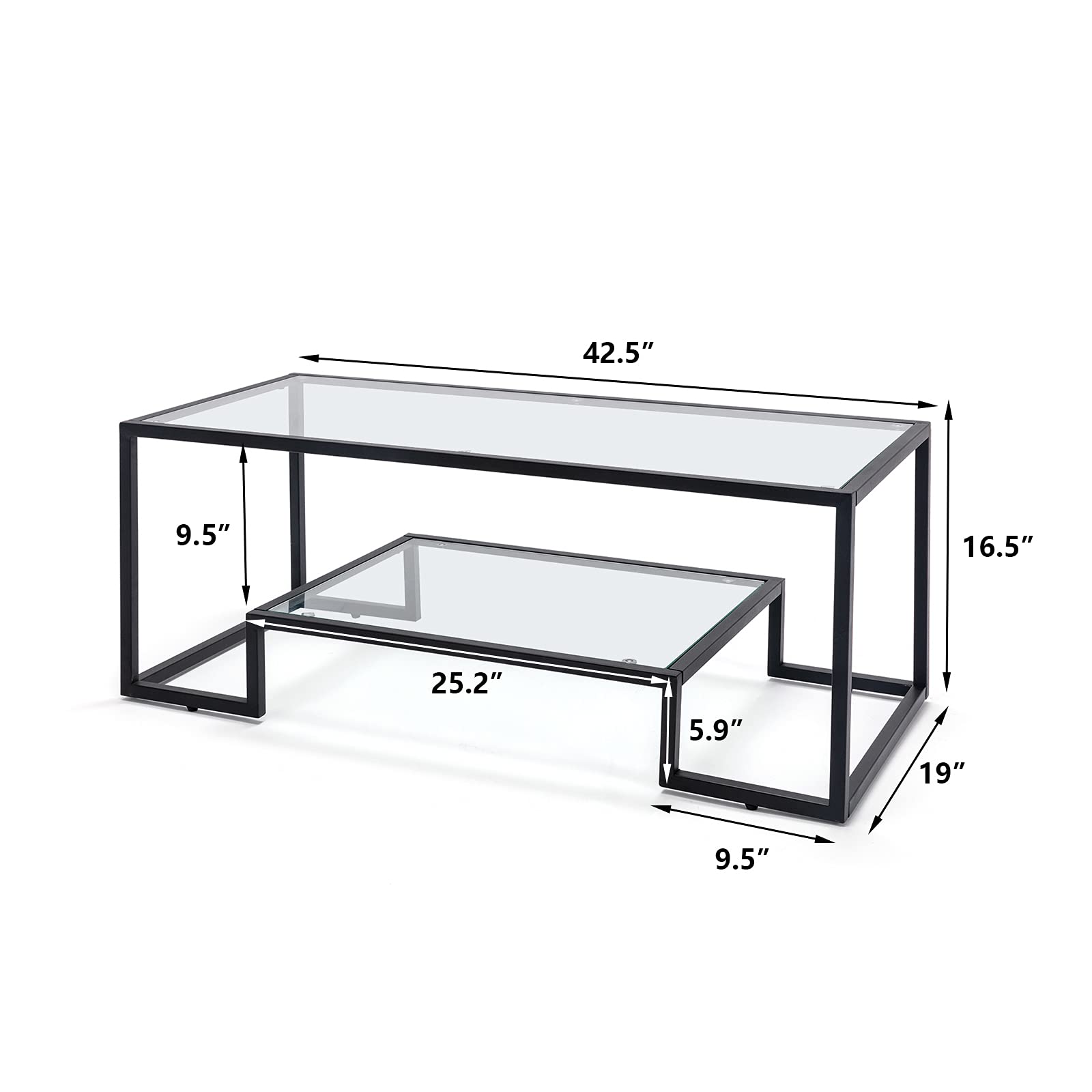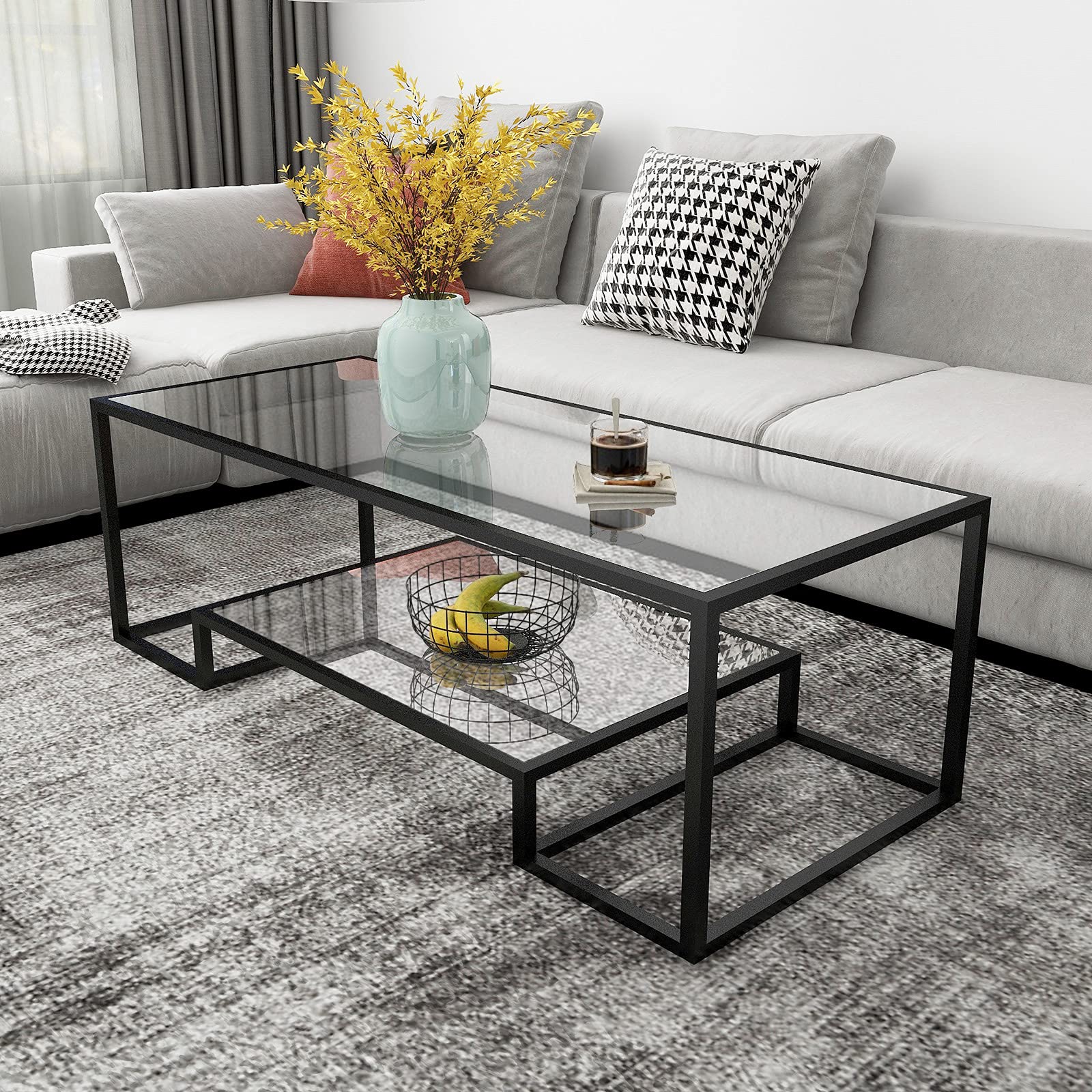 Metal Glass Coffee Table, Black Accent Modern Tempered Glass Side Table, Additional Storage Shelf, for Living Room Home Classy Furniture Office Decor