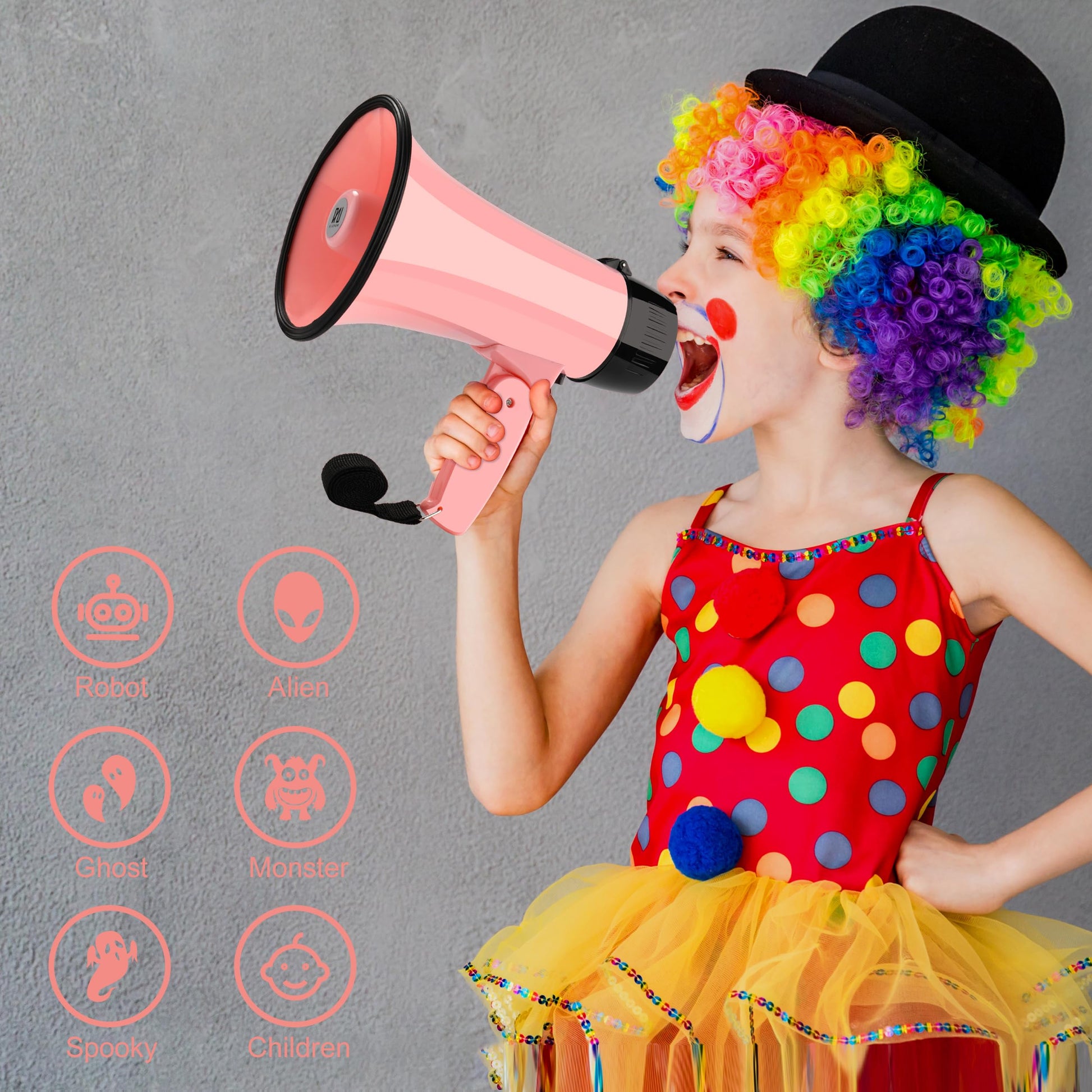 - [Voice Changer]: We creatively added 6 different voice changer effects to the bullhorn megaphone, just a single press, you can have your sound like a Child, Alien, Ghost, Robot, Spooky, or Monster, which makes it much more interesting, coupled with its compact and portable nature, it is very suitable as a gift for kids.