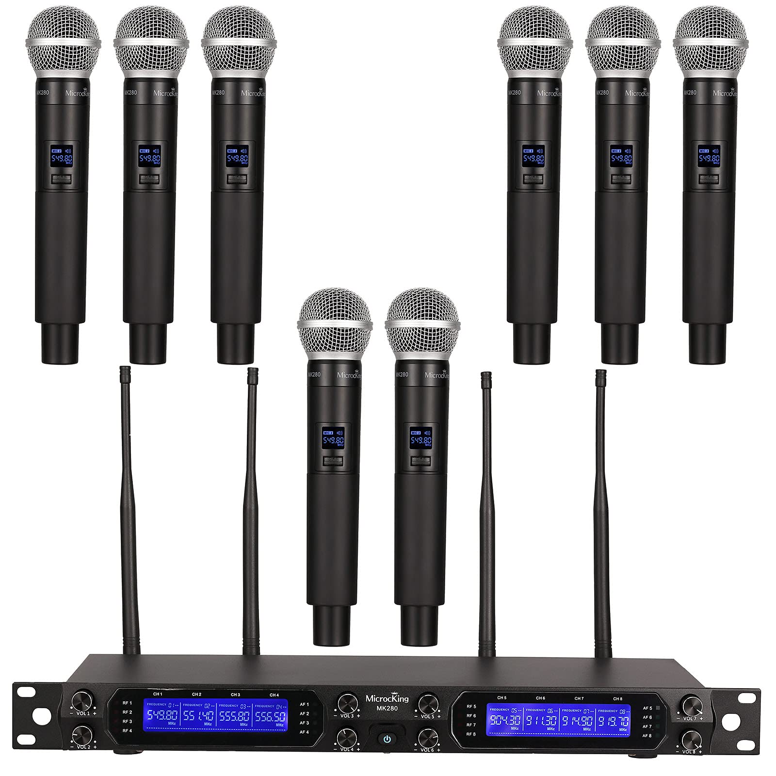 MicrocKing Wireless Microphone System, 8-Channels UHF Cordless Dynamic Handheld Mics, Long Range 400ft, Auto Connect, Ideal for Karaoke Party Wedding Speech and Outdoor Events