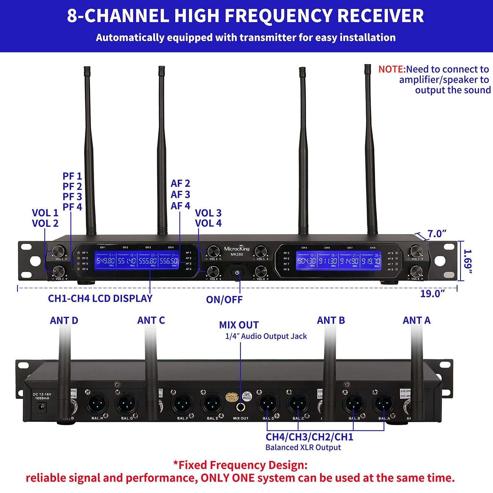 - EASY TO OPERATE: Wireless microphone receiver and wireless handheld microphone both have high-end LCD display, battery usage and working status at a glance. The receiver features eight XLR balanced outputs and one 1/4' (6.35mm) mix output jack, which automatically pairs with the transmitter for easy plug-and-play setup.