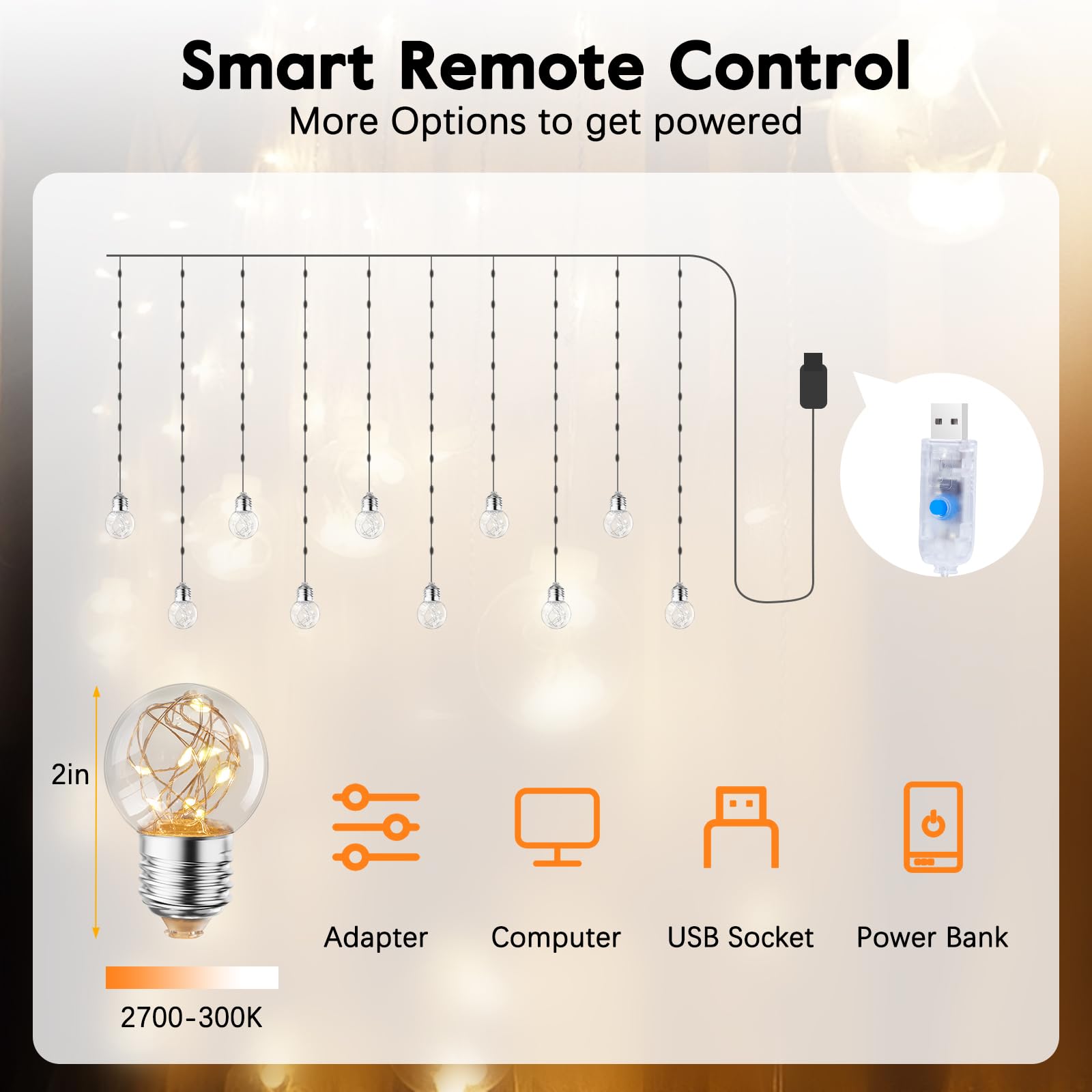 Minetom 200 LED Curtain Fairy Lights - 9.8 FT Wishing Ball Window Hanging Lights with Remote, USB Powered Waterproof for Christmas Wedding Bedroom Decoration, Warm White