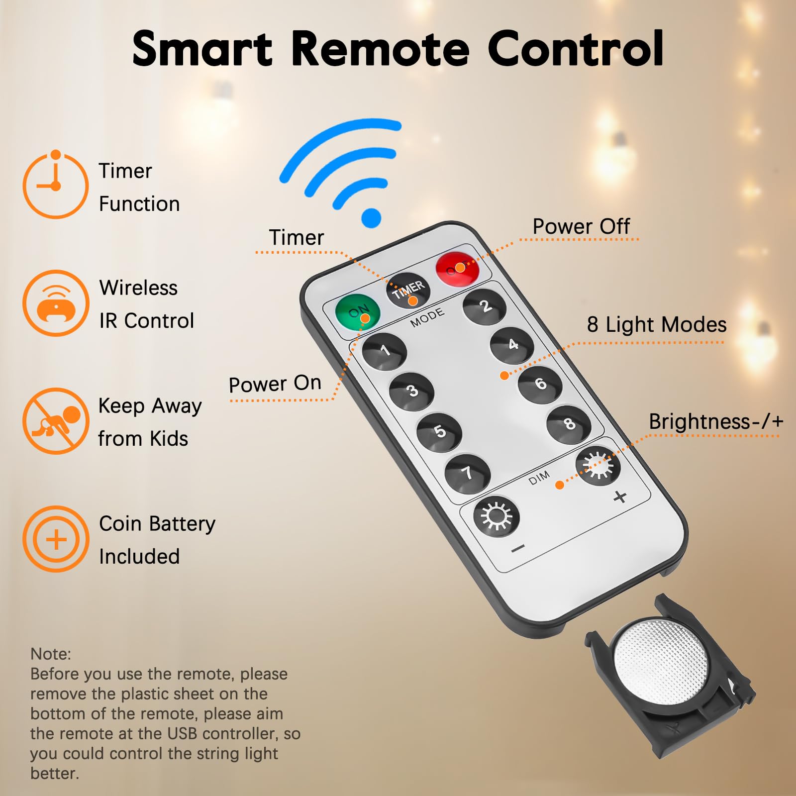 - 【Curtain Lights With Remote】- A.8 Lighting Modes: combination, in waves, sequential, slogs, chasing, slow fade, twinkle, steady on. B.Timer: 6 hours on and 18 hours off. C.Brightness Adjustable: 25% 50% 75% 100%