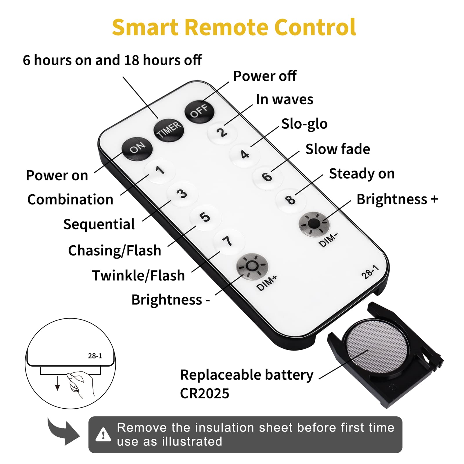 - Timer Functions and 8 Mode Lights: The rv globe lights have 8 lighting modes, namely combination, in waves, sequential, slo-glo, chasing or flash, slow fade, twinkle and flash, and steady on. The rv outdoor lights also have a memory function allowing you to set your specific mode and use the timer function on the remote to turn on the lights for 6 hours and off for 18 hours automatically every day.
