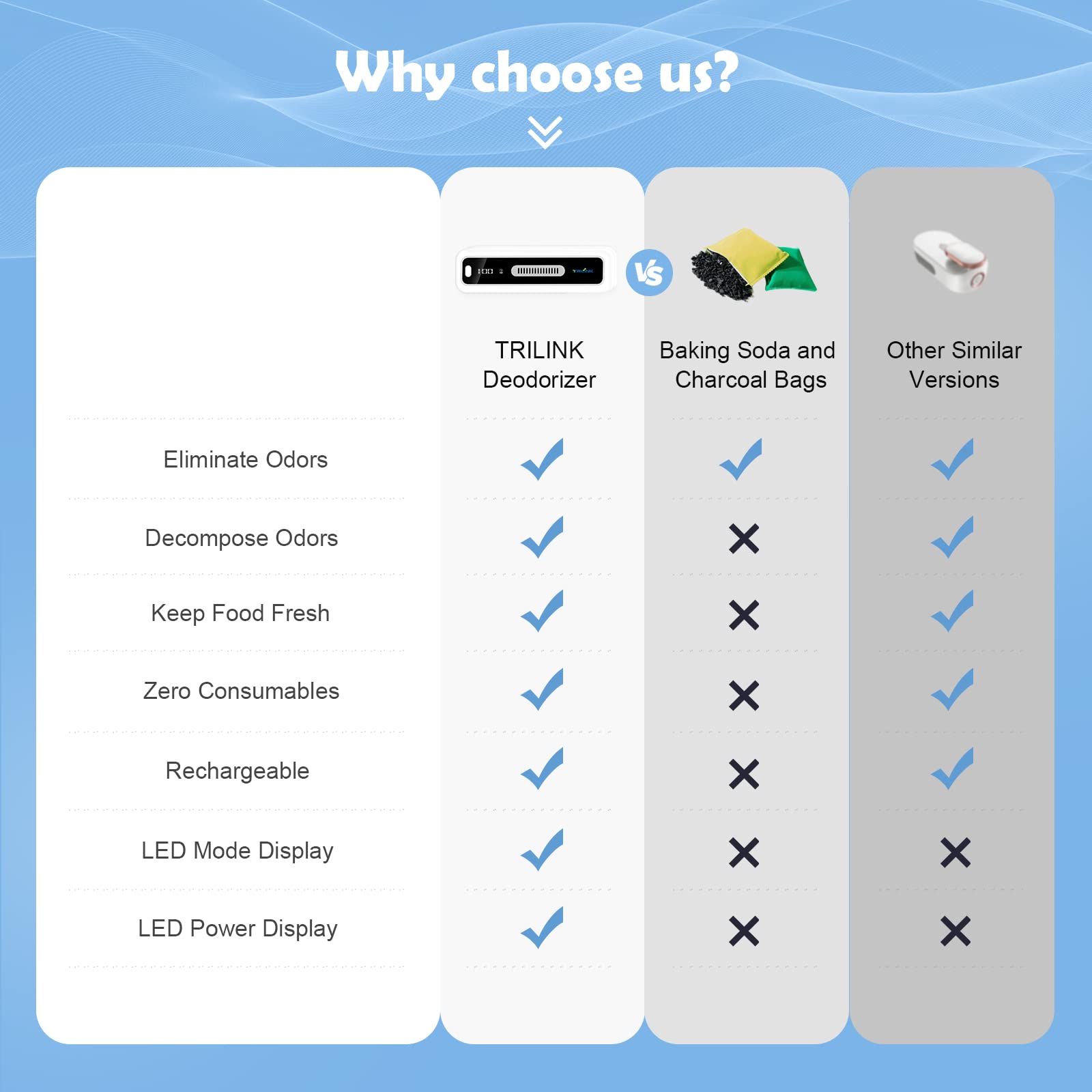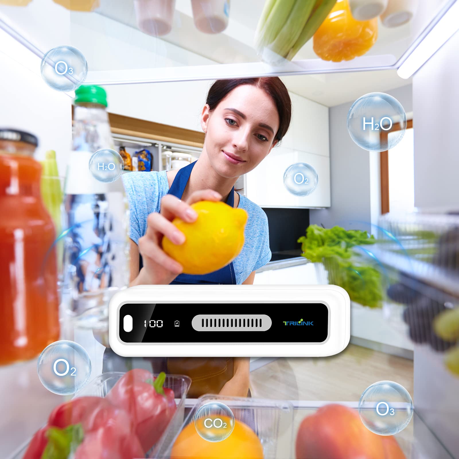 - 🥦Multipurpose O3 Deodorizer - TRILINK refrigerator deodorizer can effectively reducing unpleasant odors in closed environments like fridges, freezers, shoe cabinets, closets, wardrobes, cars, pet rooms, etc. It also prolongs the shelf life of food and keep food fresh.