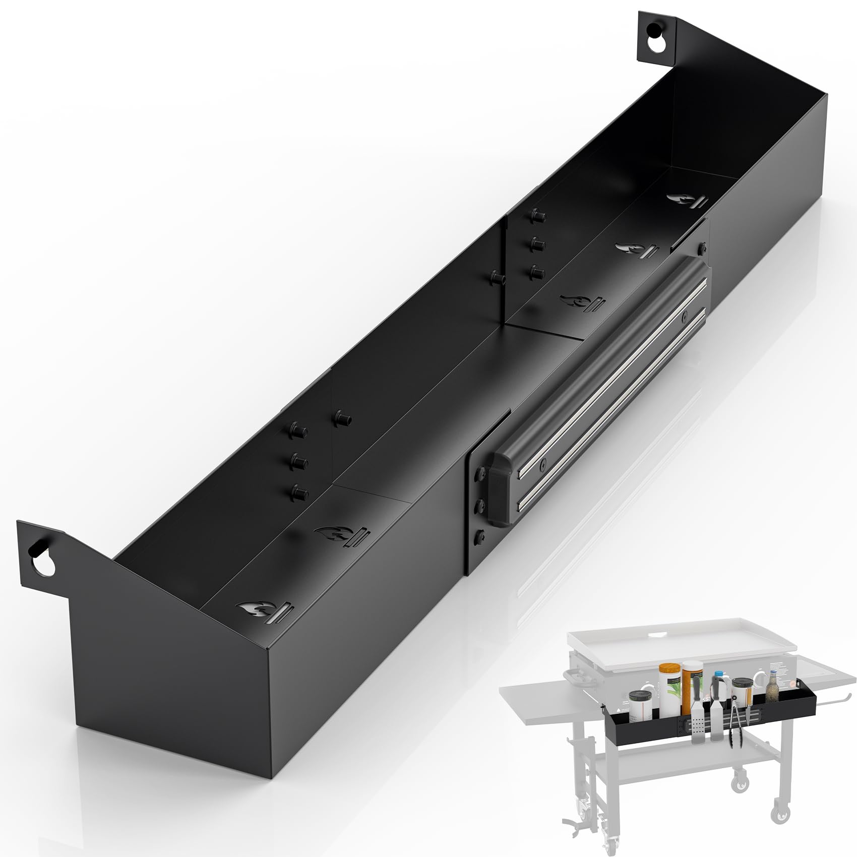 - FRONT GRIDDLE CADDY FOR EASY ACCESS: Our black stone griddle front caddy tray 36 inch are designed for convenience, unlike side tables or side caddy, you won't knocking over condiments or struggle to find utensils, and you can keep all your cooking essentials within easy reach. This blackstone front storage bin with free up space on your side shelves and keep your counter top clean and organized