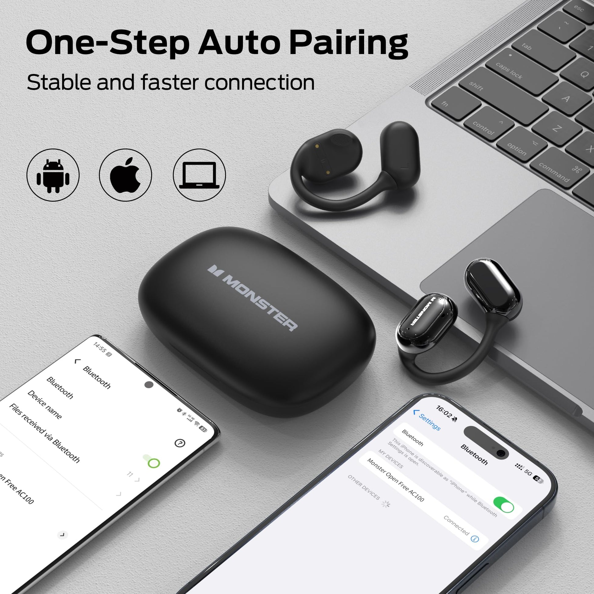 - 【Advanced Bluetooth 5.3】With advanced Bluetooth headphones 5.3 technology, you can get 2X fast transfer speed (75% higher than the previous generation) and a more stable connection. Wireless headphones will be paired with each other automatically, and just hit on Bluetooth list 'Monster Open Free AC100' on your device to connect, avoiding complex operations and saving waiting time. Whether you're pairing with your smartphone, tablet, or laptop, enjoy stable and efficient wireless connections for uninterrupted music enjoyment.