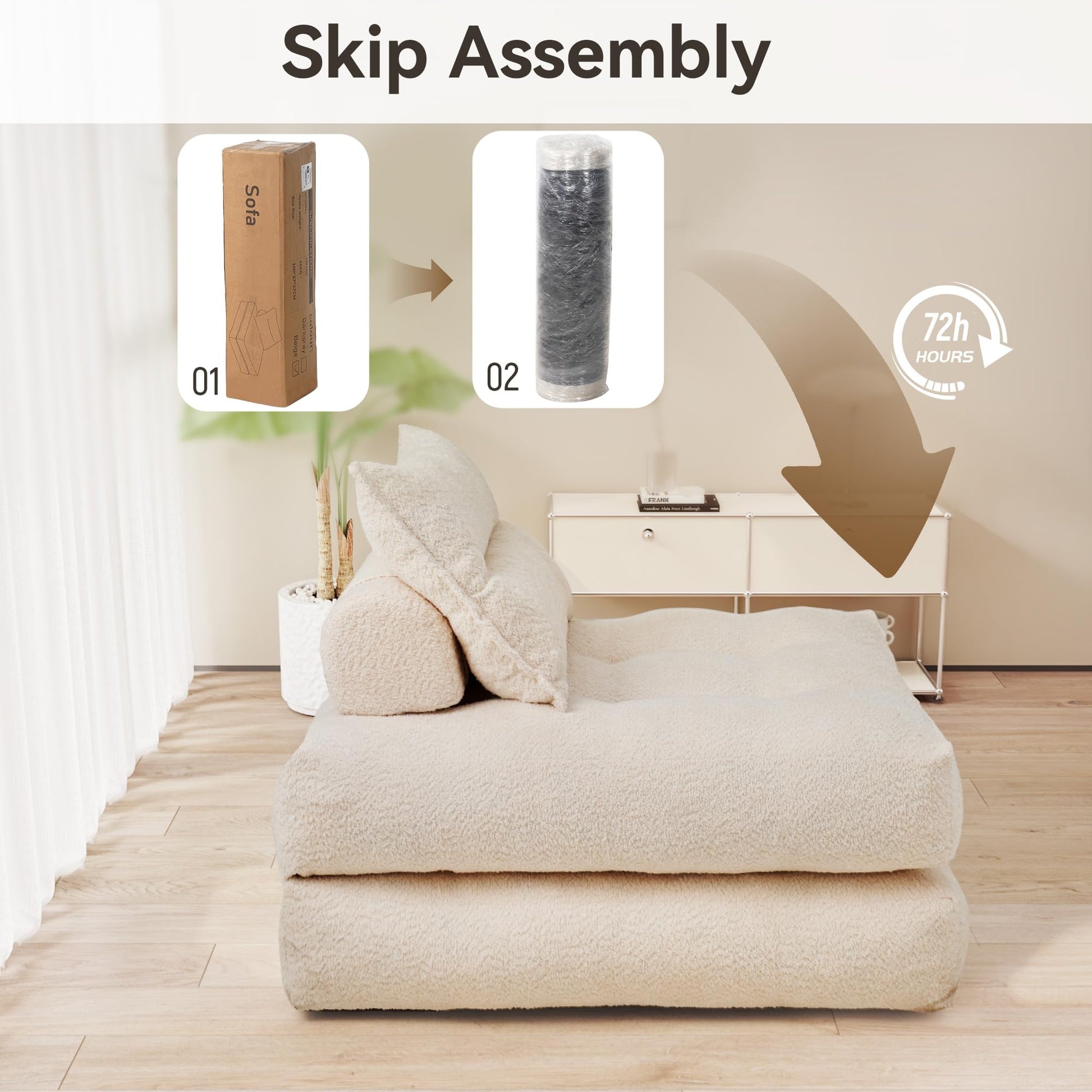 - No Assembly Required, More Stable - When you get this lazy sofa with pillow, it has been fully compressed. Only need to open the box and packaging and gently tap each part to speed it back to its original state. (Normally, natural recovery takes about 72 hours) This can greatly save your assembly time and enjoy a brand new futon couch faster. At the same time, the bottom of the convertible floor mattress has anti-skid particles to prevent sliding, ensure a stable fixation, and be safer to use.